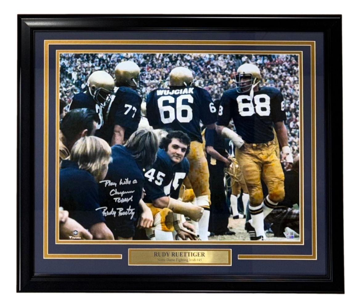 Rudy Ruettiger Signed Notre Dame Fighting Irish Custom Framed Photo Inscribed "Play Like A Champion" (Fanatics)