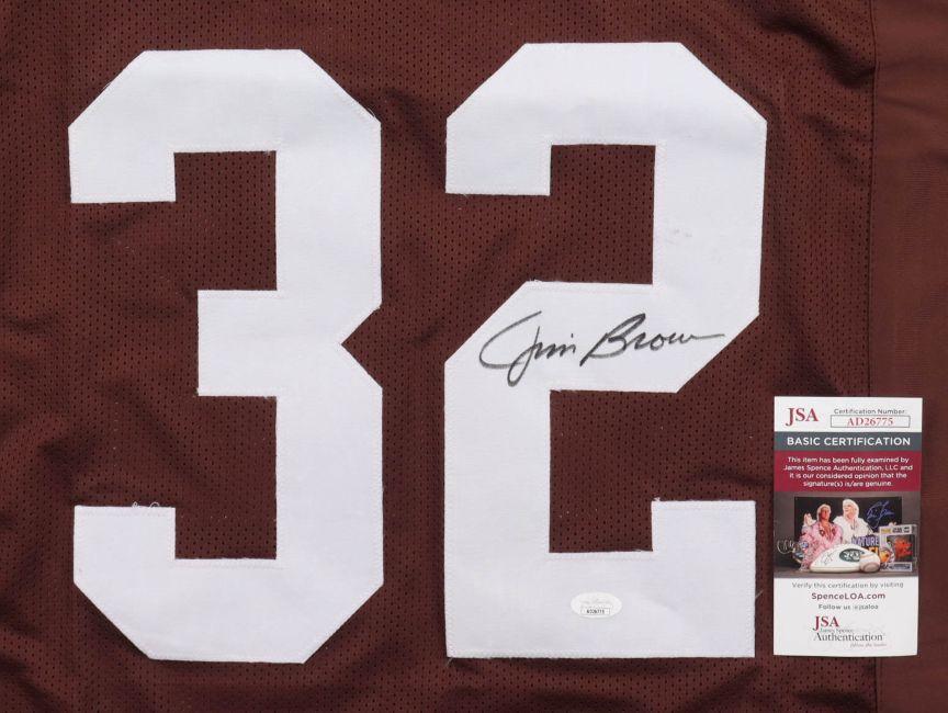 Custom jersey with everything sewn on, size XL. Hand-signed by Jim Brown (D. 2023).