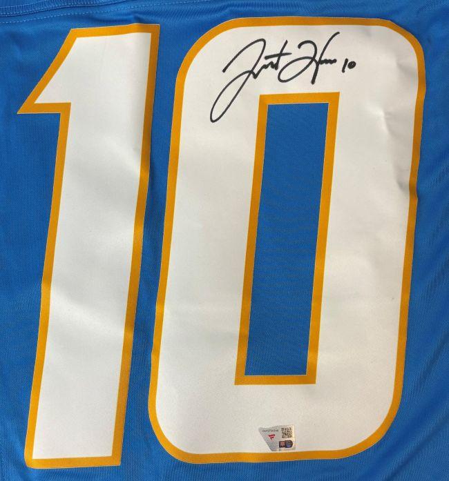 Nike jersey with everything pressed on, size L. Hand-signed by Justin Herbert (Los Angeles Chargers).