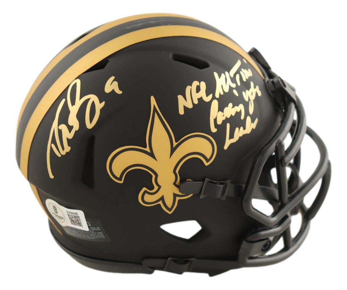 Riddell New Orleans Saints eclipse alternate speed mini helmet has been hand-signed and inscribed by Drew Brees.