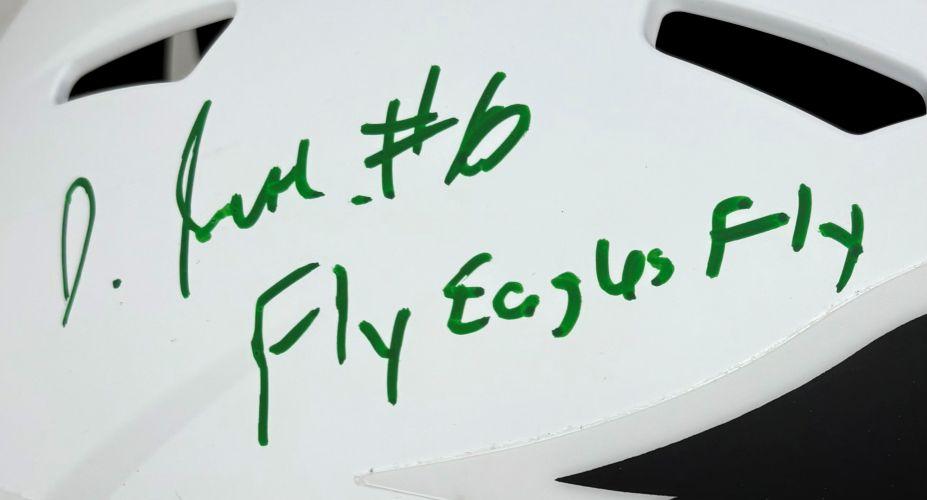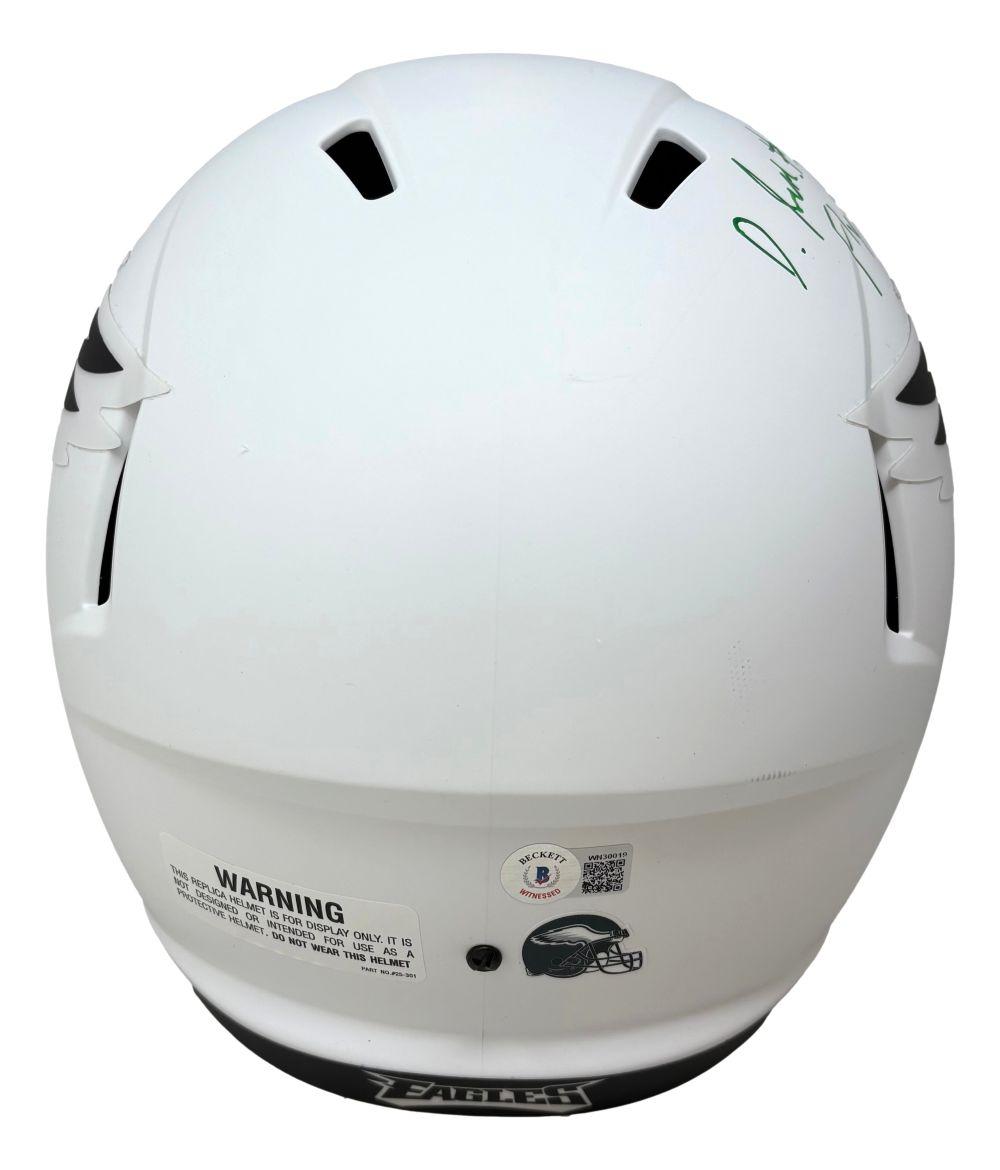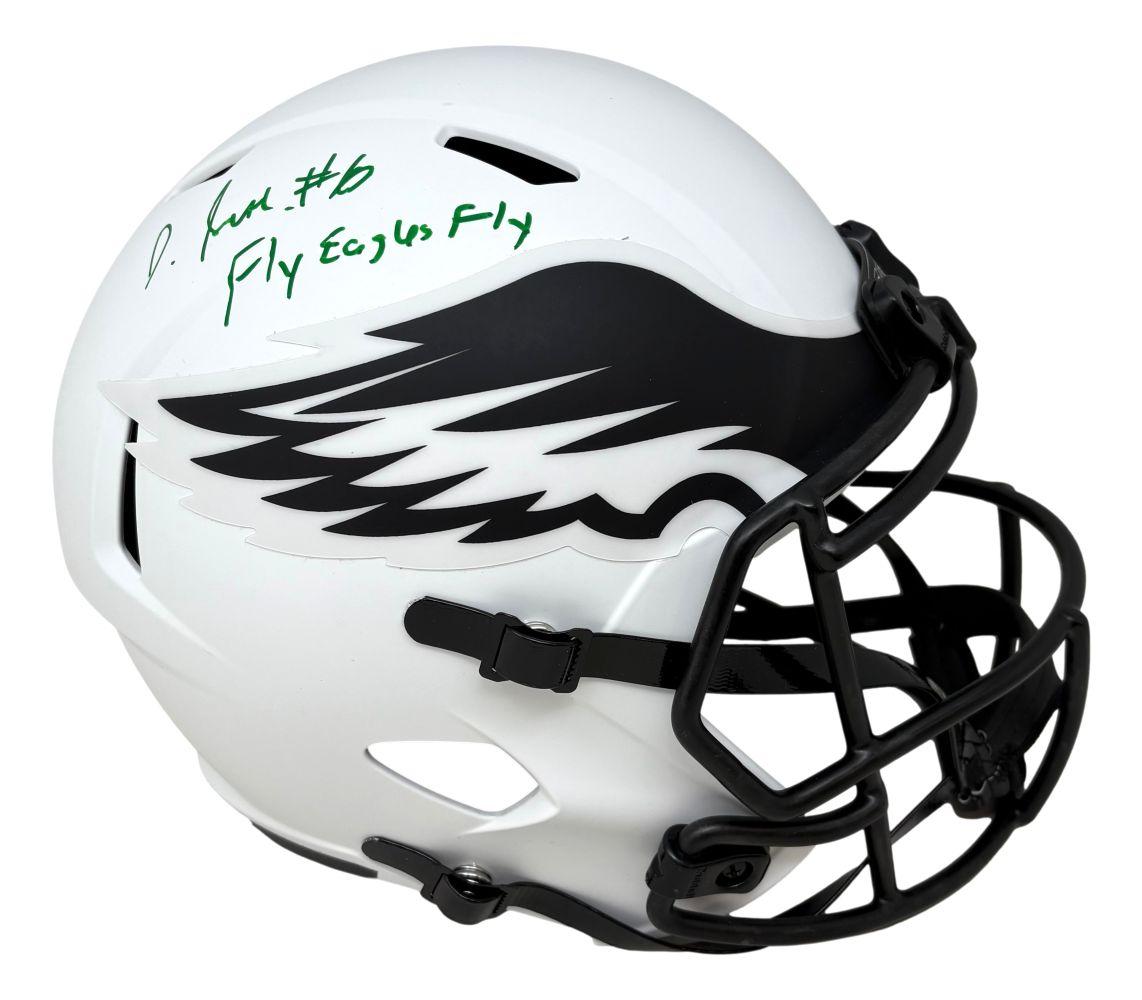 Riddell Philadelphia Eagles full-size lunar eclipse alternate speed replica helmet has been hand-signed and inscribed by DeVonta Smith.