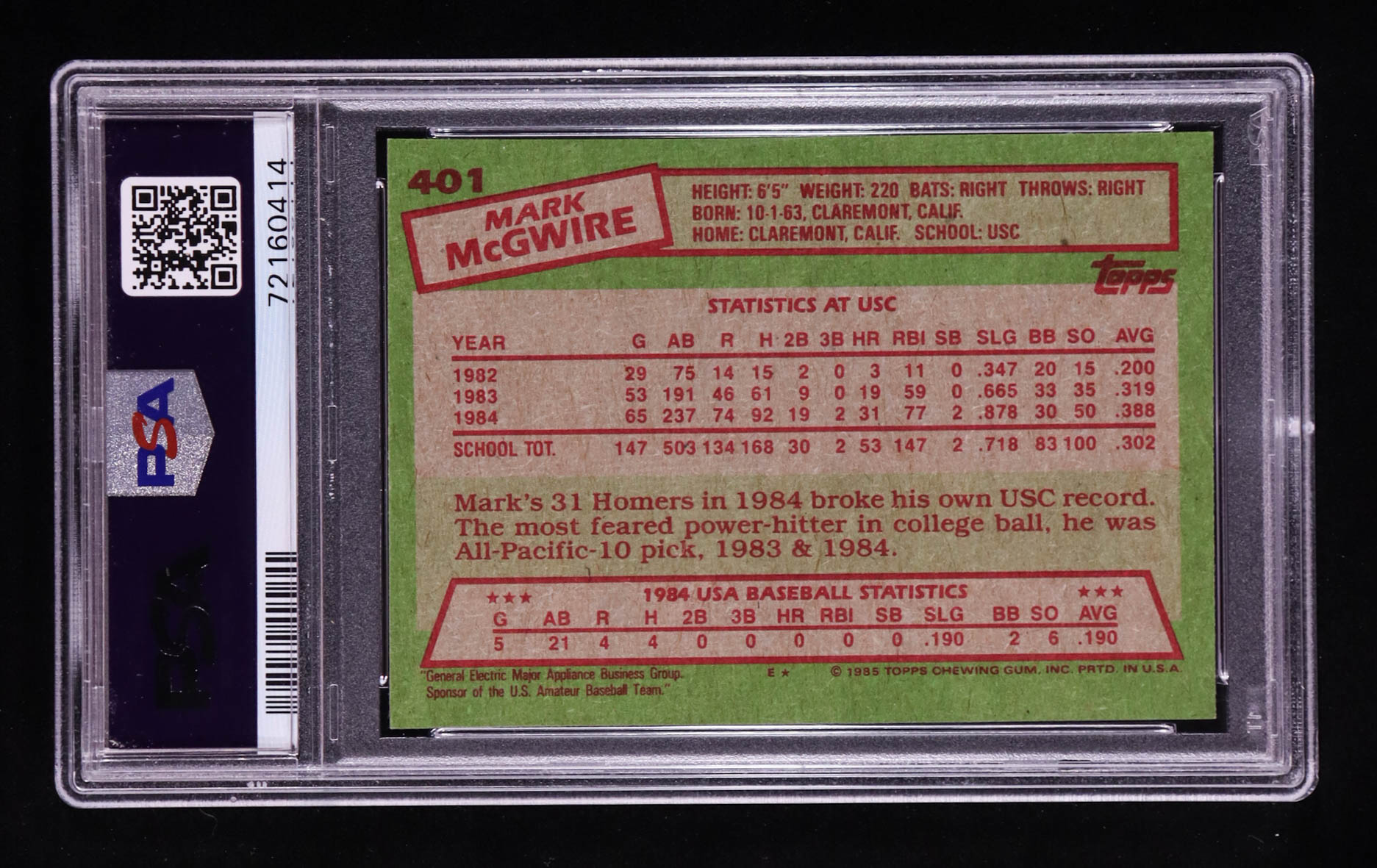 Mark McGwire 1985 Topps #401 OLY RC (PSA 7)