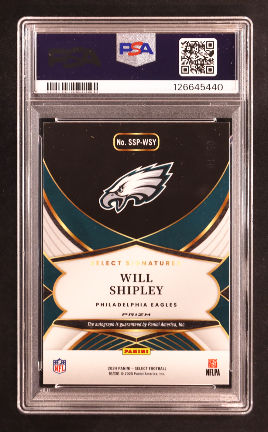 Will Shipley 2024 Panini Select Signatures Gold Prizm Autograph #SSPWSY RC #01/50 (PSA 8)
