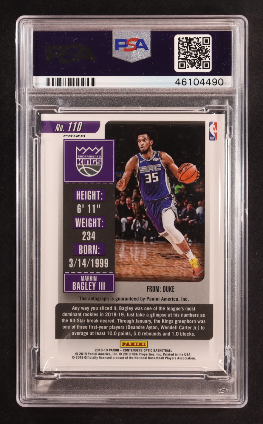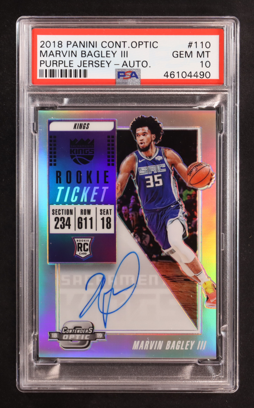 Marvin Bagley III 2018-19 Panini Contenders Optic Purple Jersey Rookie Ticket Auto #110 RC (PSA 10)