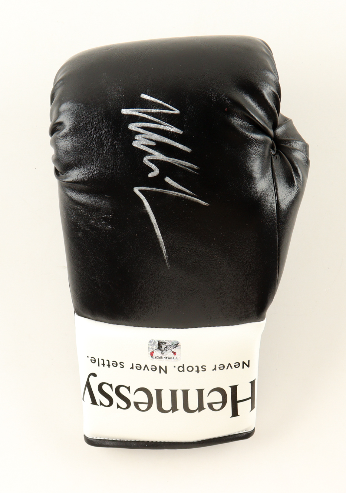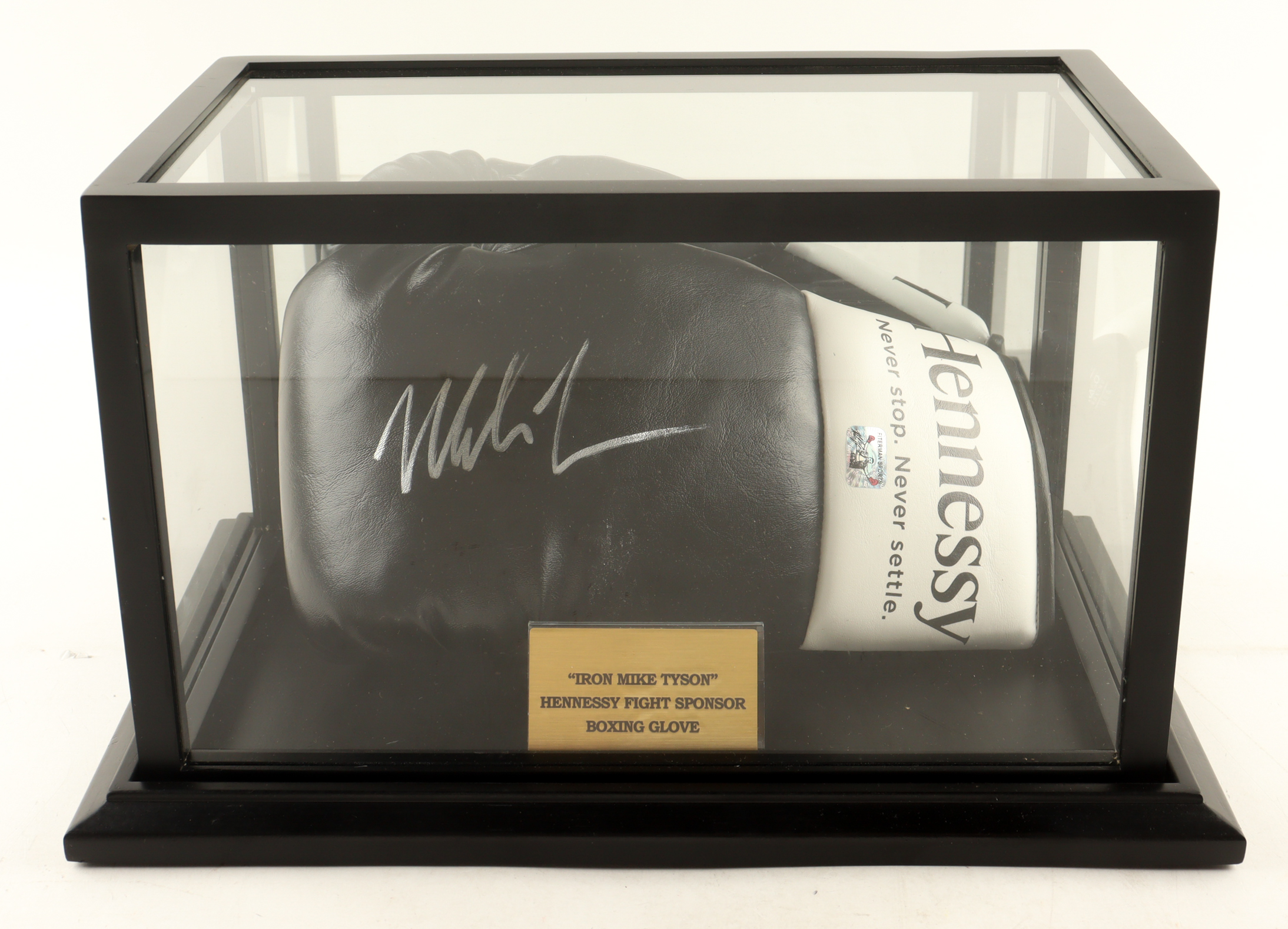 Hennessy model boxing glove has been hand-signed by Mike Tyson (HOF). Display case and title plaque is included as shown.