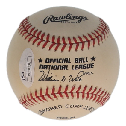 Rawlings Official National League Baseball. Hand-signed and inscribed by Ferguson Jenkins (Chicago Cubs, HOF). Please note, the baseball is naturally toned.