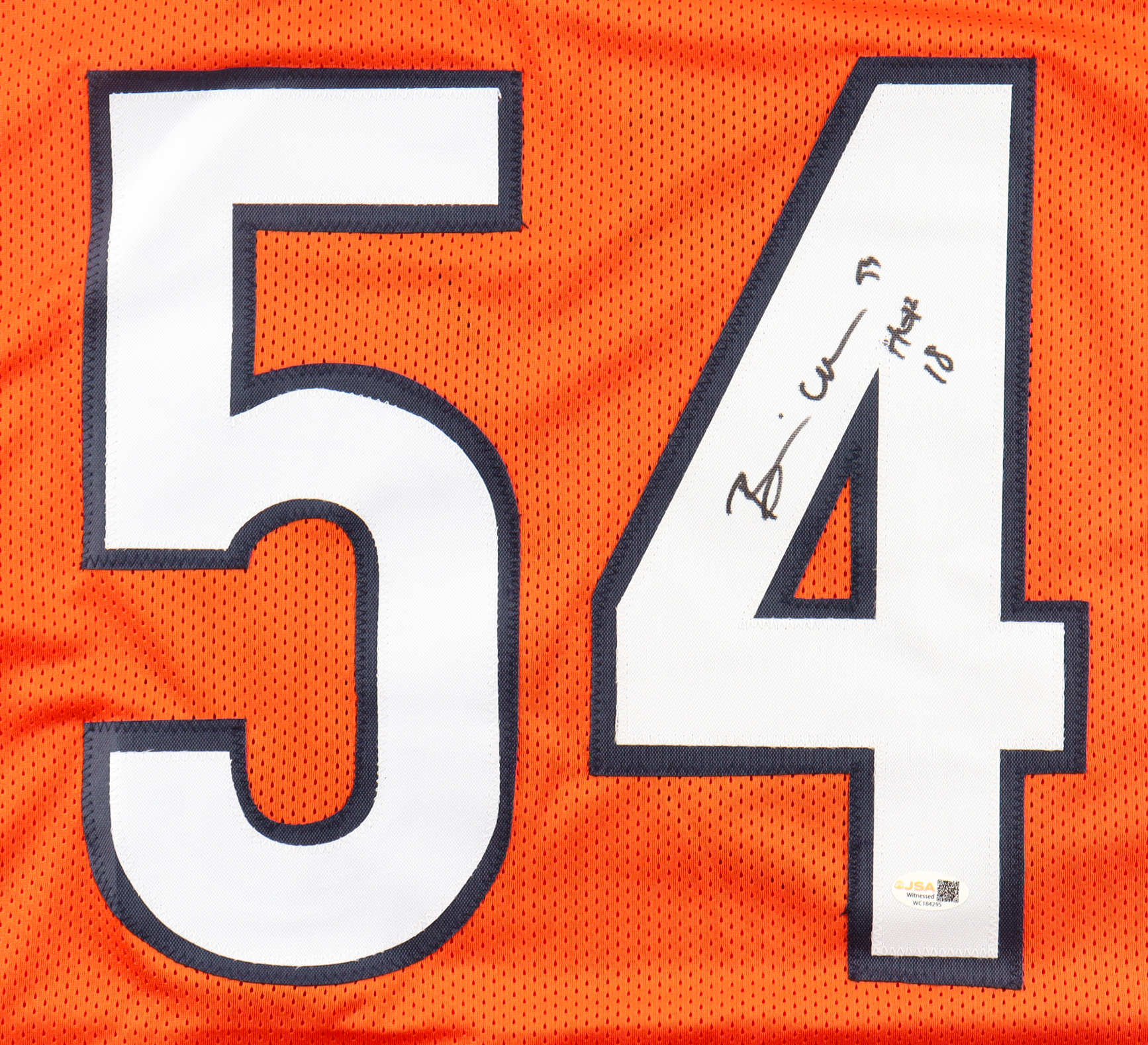 Custom jersey with everything sewn on, size XL. Hand-signed and inscribed by Brian Urlacher (HOF).