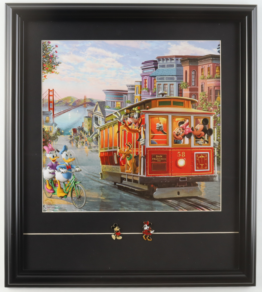 Thomas Kinkade Walt Disney's "Mickey & Friends in San Francisco" Custom Framed Print Display With Set of (2) Mickey & Minnie Pins