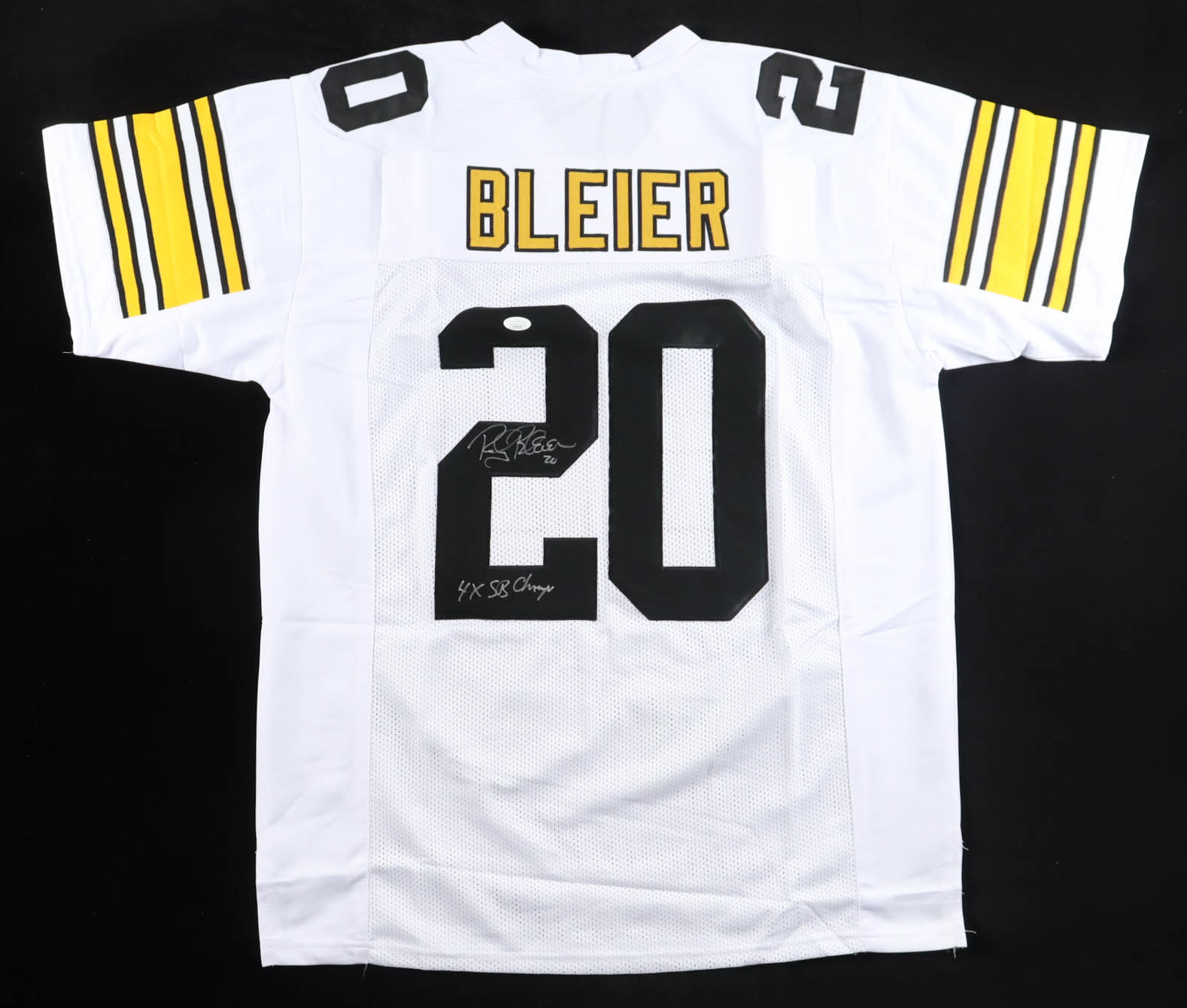 Custom jersey. Everything sewn on, size XL. Hand-signed and inscribed by Rocky Bleier.