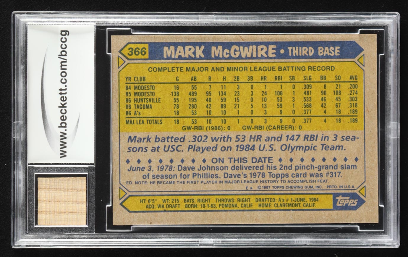 Mark McGwire 1987 Topps #366 Game-Used Bat RC (BCCG 10)
