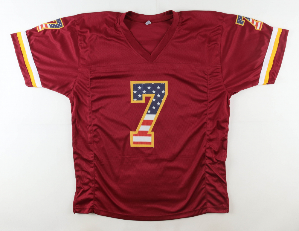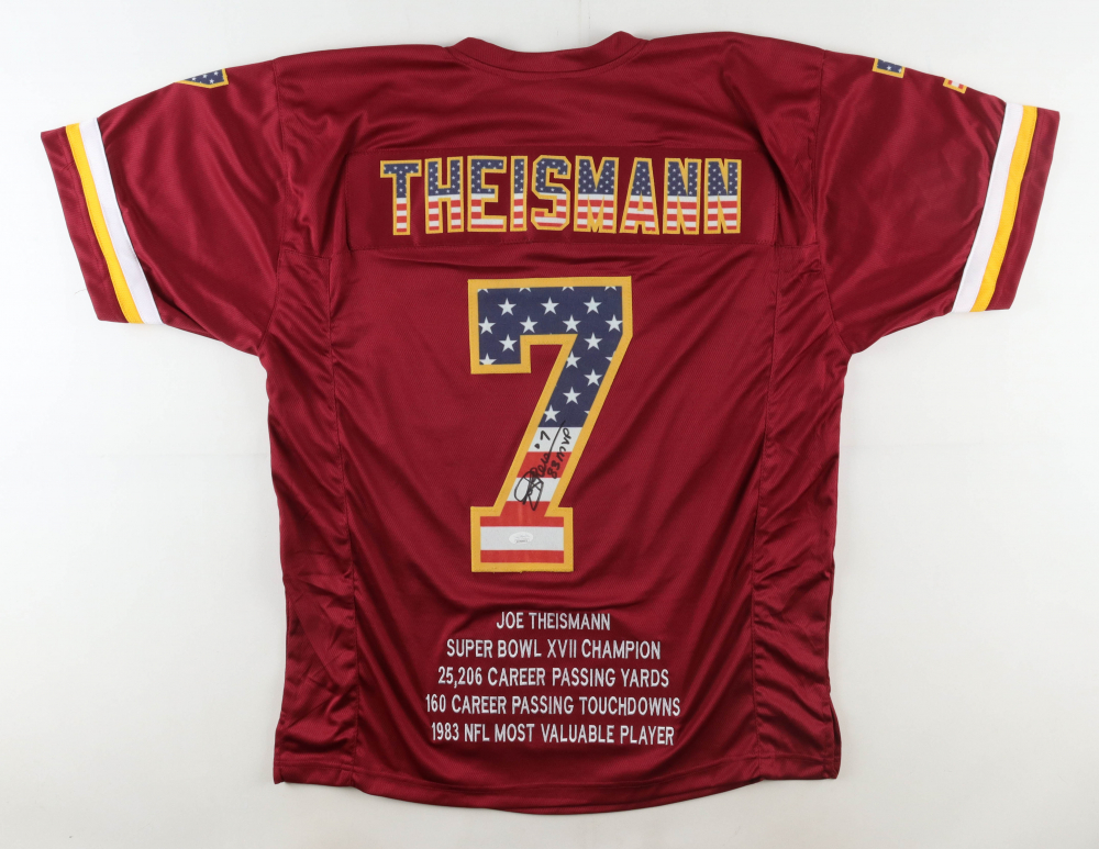 Custom jersey with everything sewn on, size XL. Hand-signed and inscribed by Joe Theismann (Washington Redskins). Theismann's career highlight statistics have been custom-stitched below the reverse number.