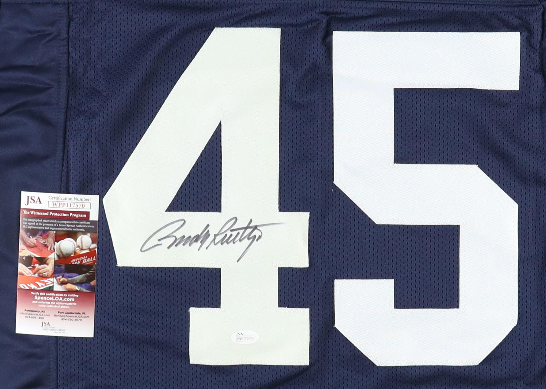 Custom jersey with everything sewn on, size XL. Hand-signed by Rudy Ruettiger (Notre Dame Fighting Irish).