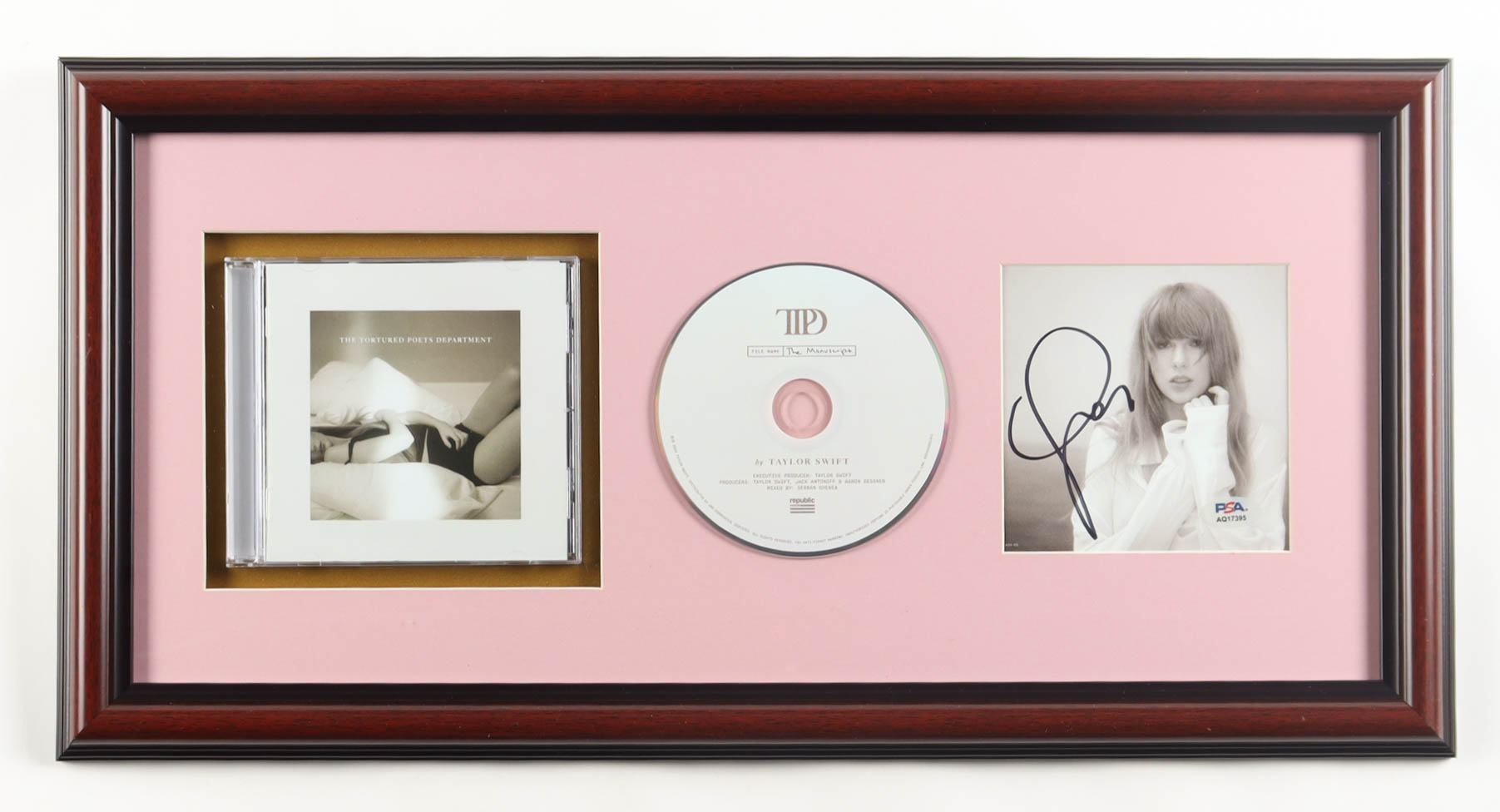 Custom frame measures approximately 10.5" x 20.5" in size. Features a "The Torture Poets Department" CD insert that has been hand-signed by Taylor Swift. The display also includes the disc case as shown.