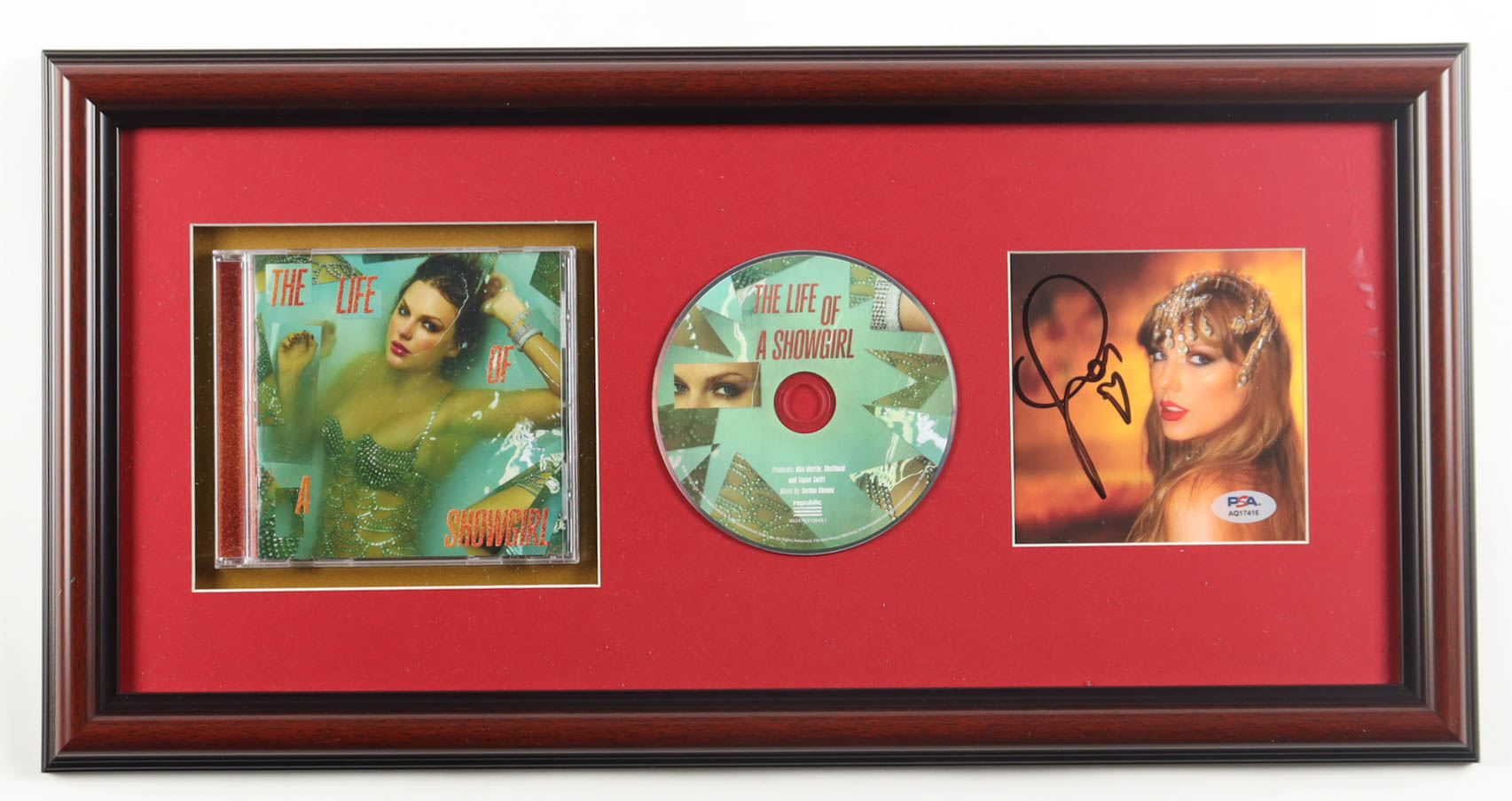 Custom frame measures approximately 10.5" x 20.5" in size. Features a "The Life of A Showgirl" CD insert that has been hand-signed by Taylor Swift. The display also includes the disc case as shown.
