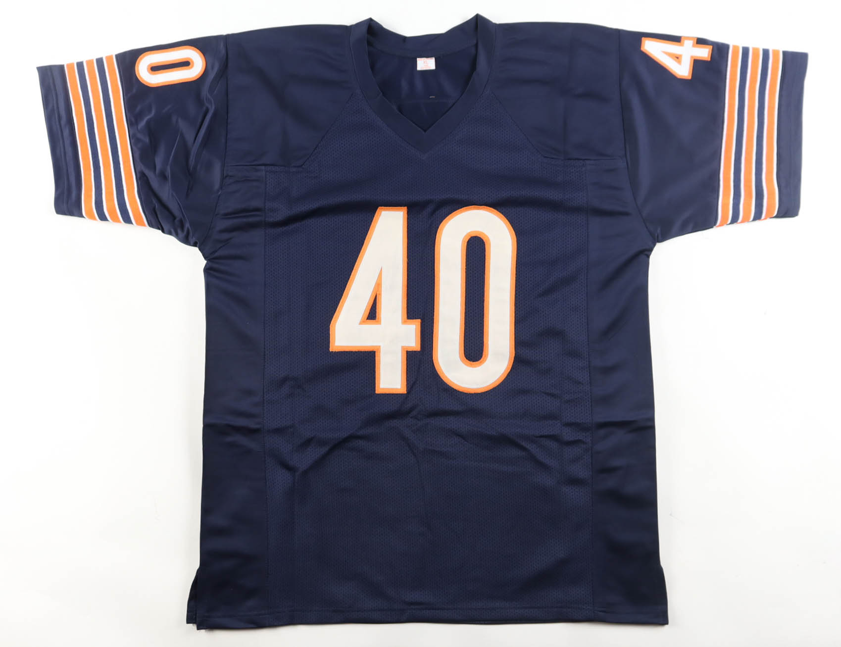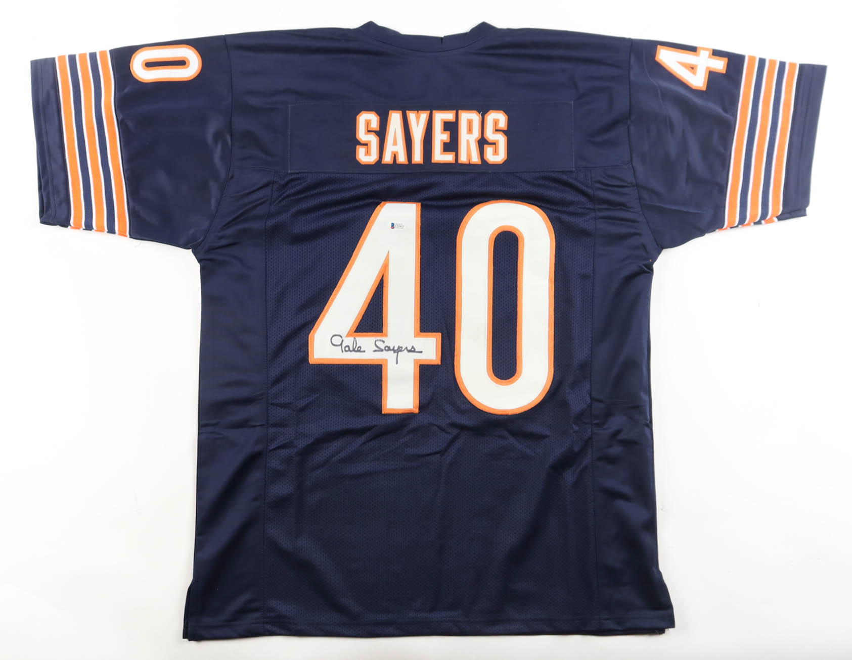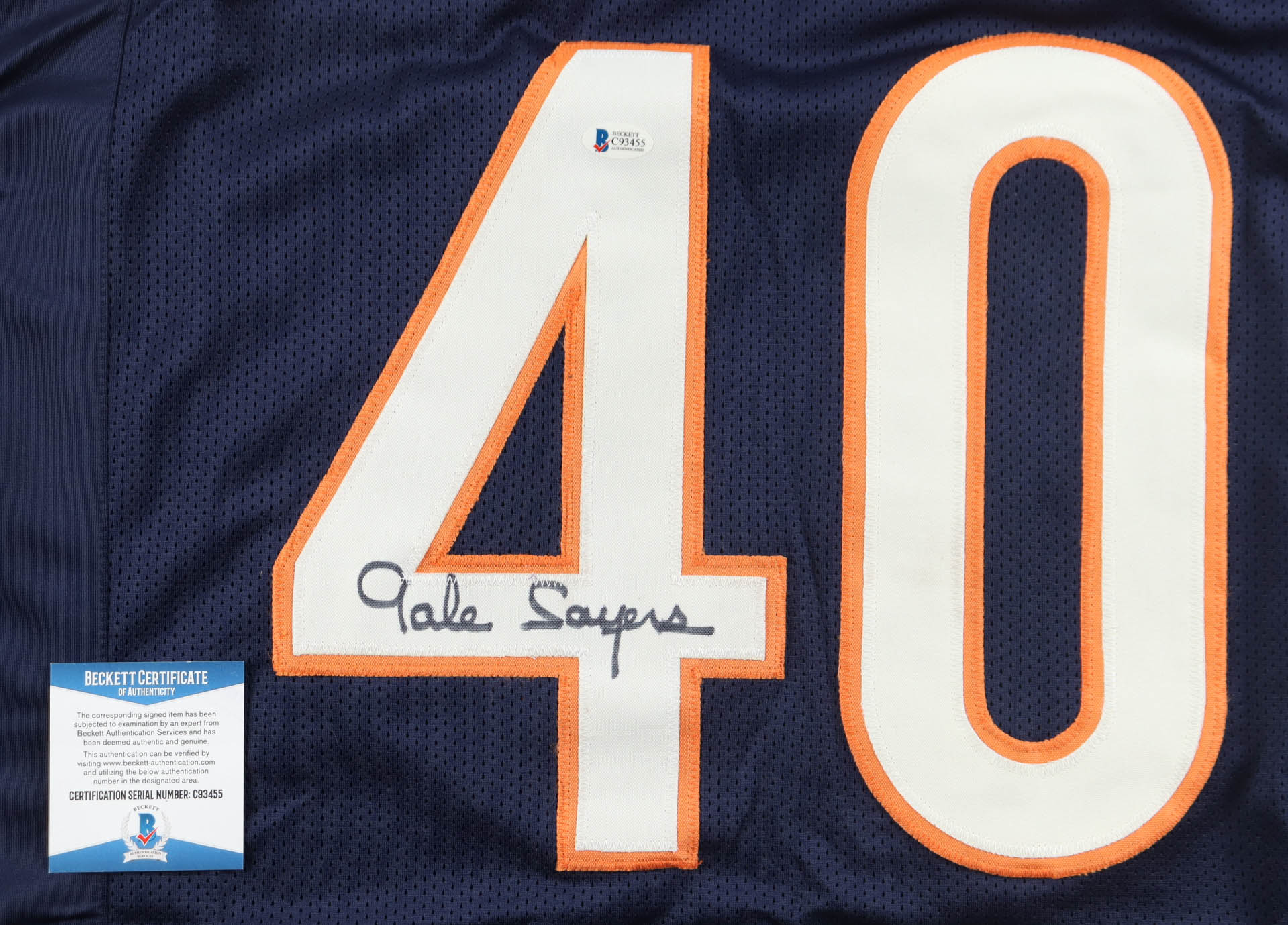 Custom jersey with everything sewn on, size XL. Hand-signed by Gale Sayers (D. 2020, HOF).