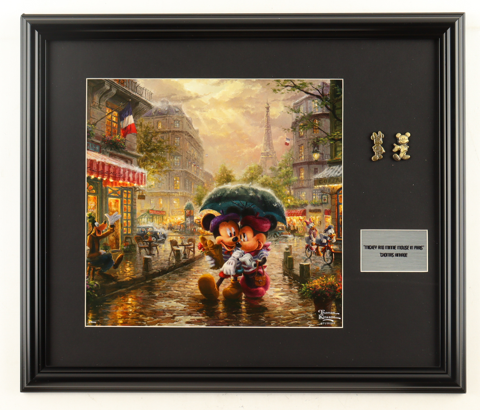 Thomas Kinkade Walt Disney's "Mickey & Minnie Mouse in Paris" Custom Framed Print Display With (2) Mickey & Minnie Brass Pins