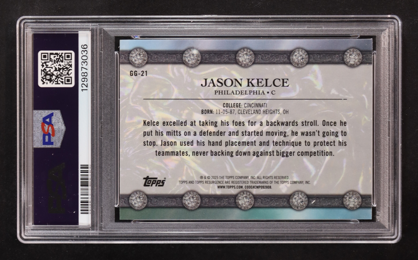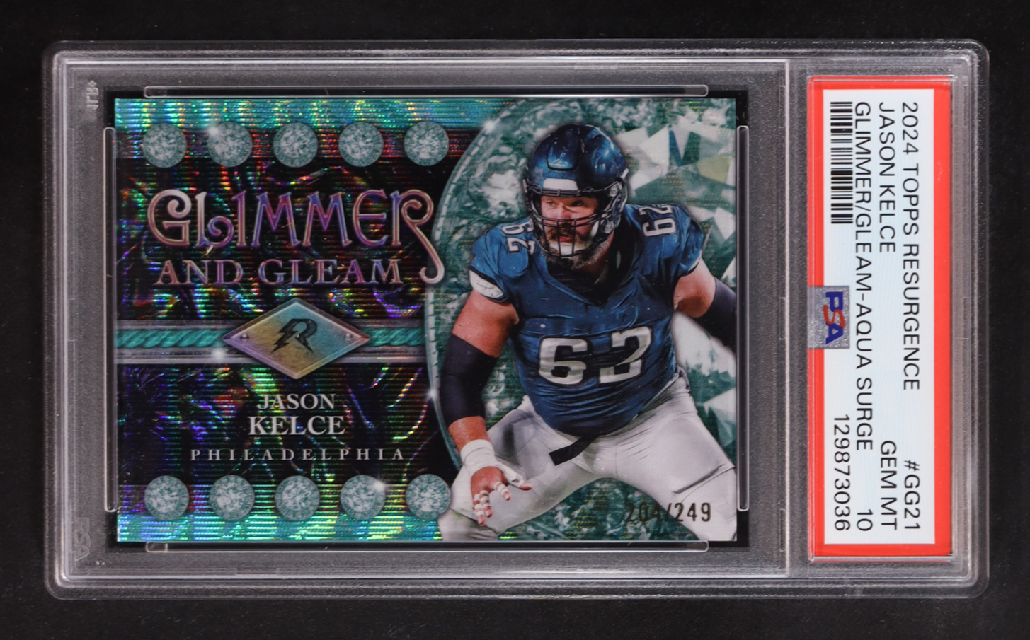 Jason Kelce 2024 Topps Resurgence Glimmer and Gleam Aqua Surge #GG21 #204/249 (PSA 10)