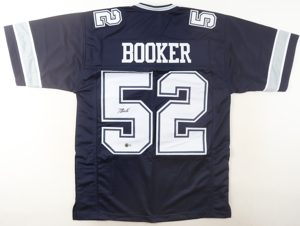 Custom jersey with everything sewn on, size XL. Hand-signed by Tyler Booker. Please note, there is a stray pen mark near the signature.