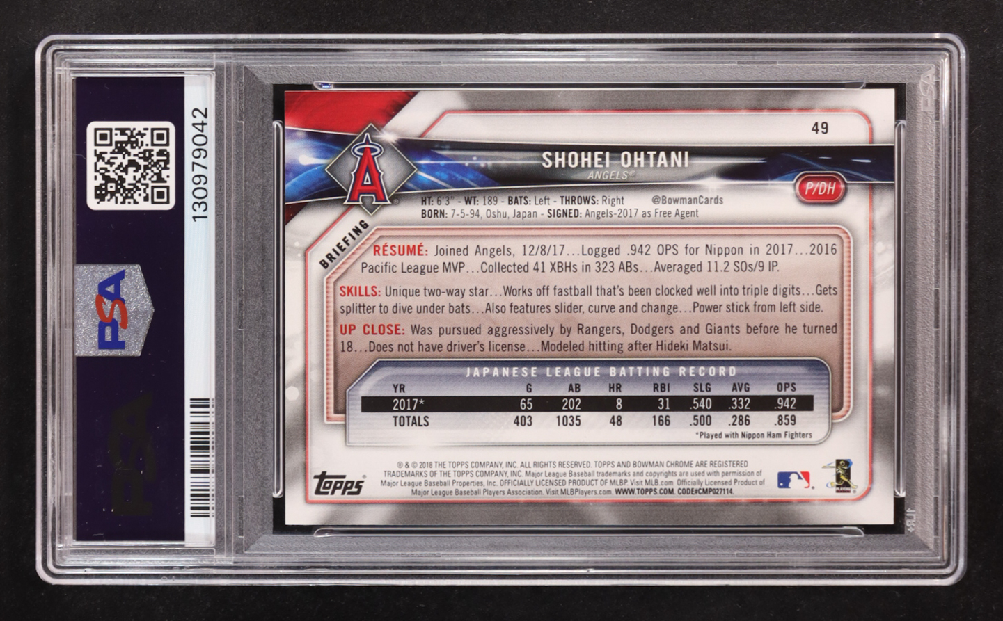 Shohei Ohtani 2018 Bowman #49 RC (PSA 9)