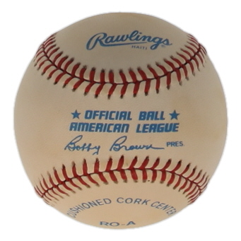 Rawlings Official American League Baseball. Hand-signed by Mickey Mantle (D. 1995, New York Yankees, HOF). Please note, the baseball is naturally toned and stained.