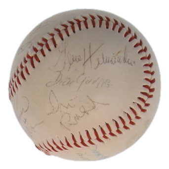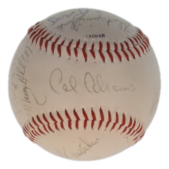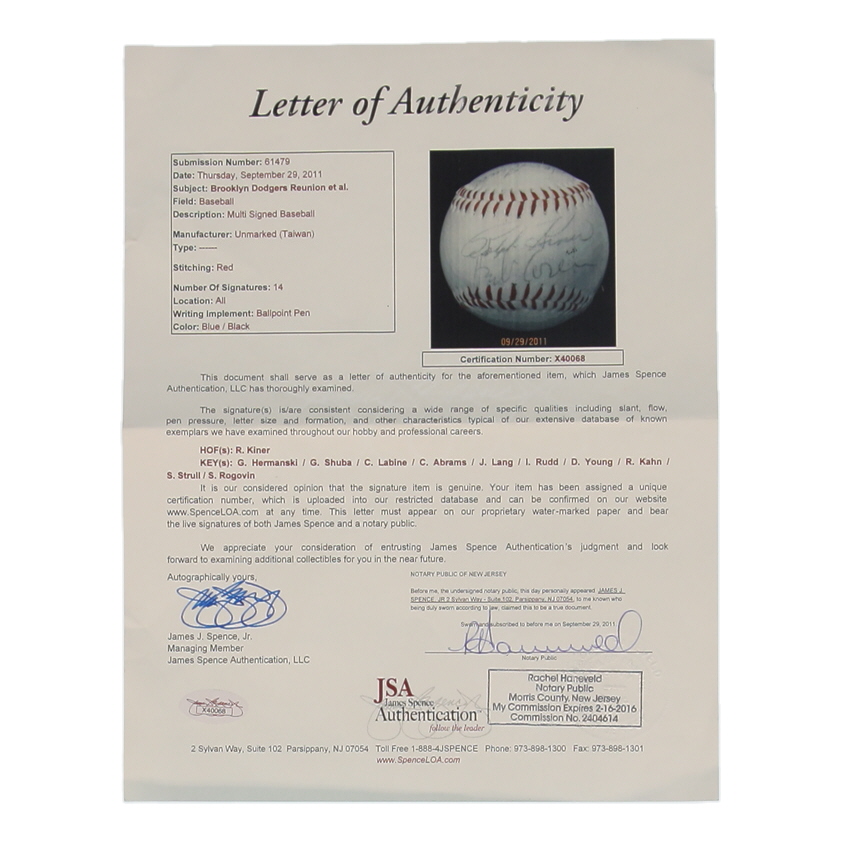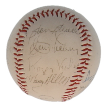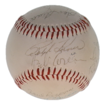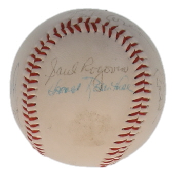 Baseball has been hand-signed by Ralph Kiner, Gene Hermanski, George Shuba, Clem Labine, Cal Abrams, Jack Lang, Irving Rudd, Dick Young, Roger Kahn, Stan Strull, Saul Rogovin, and (3) others. Please note, there are stains throughout the baseball and the logos are faded.