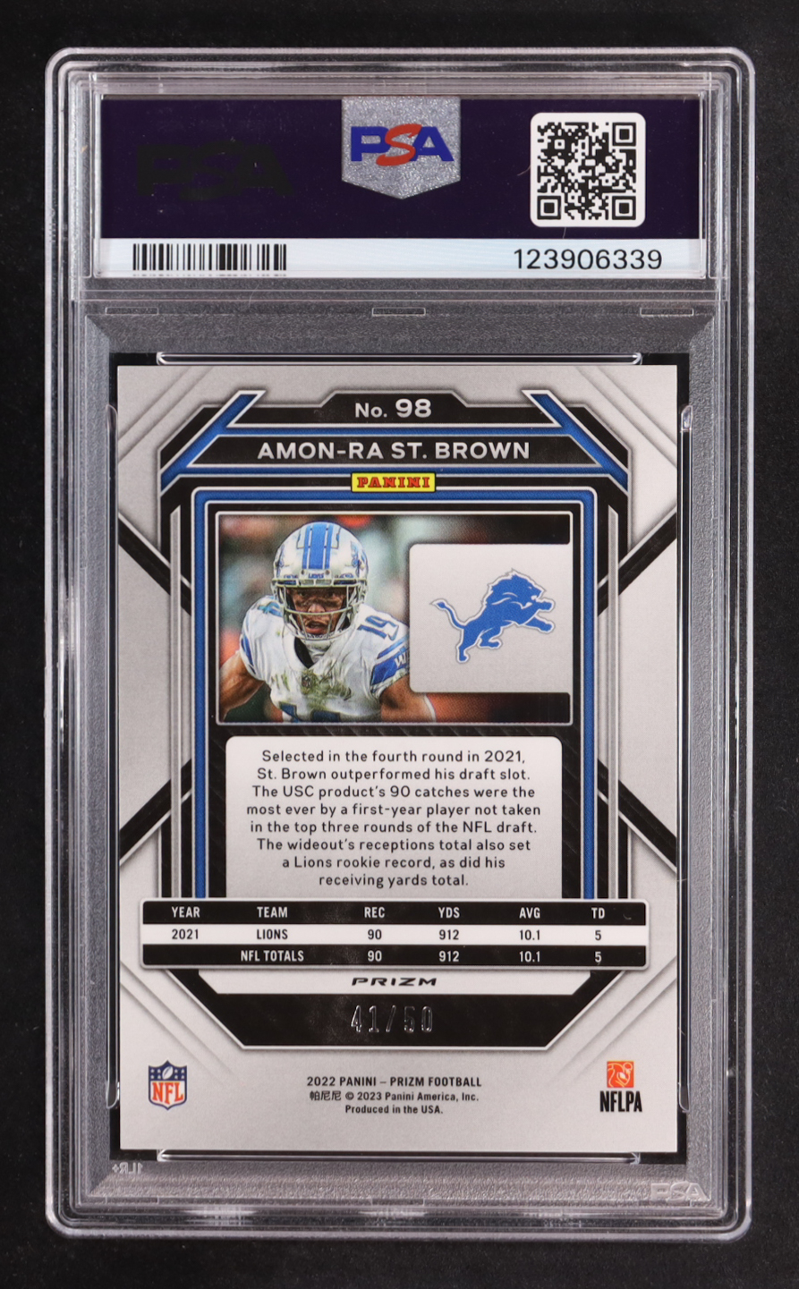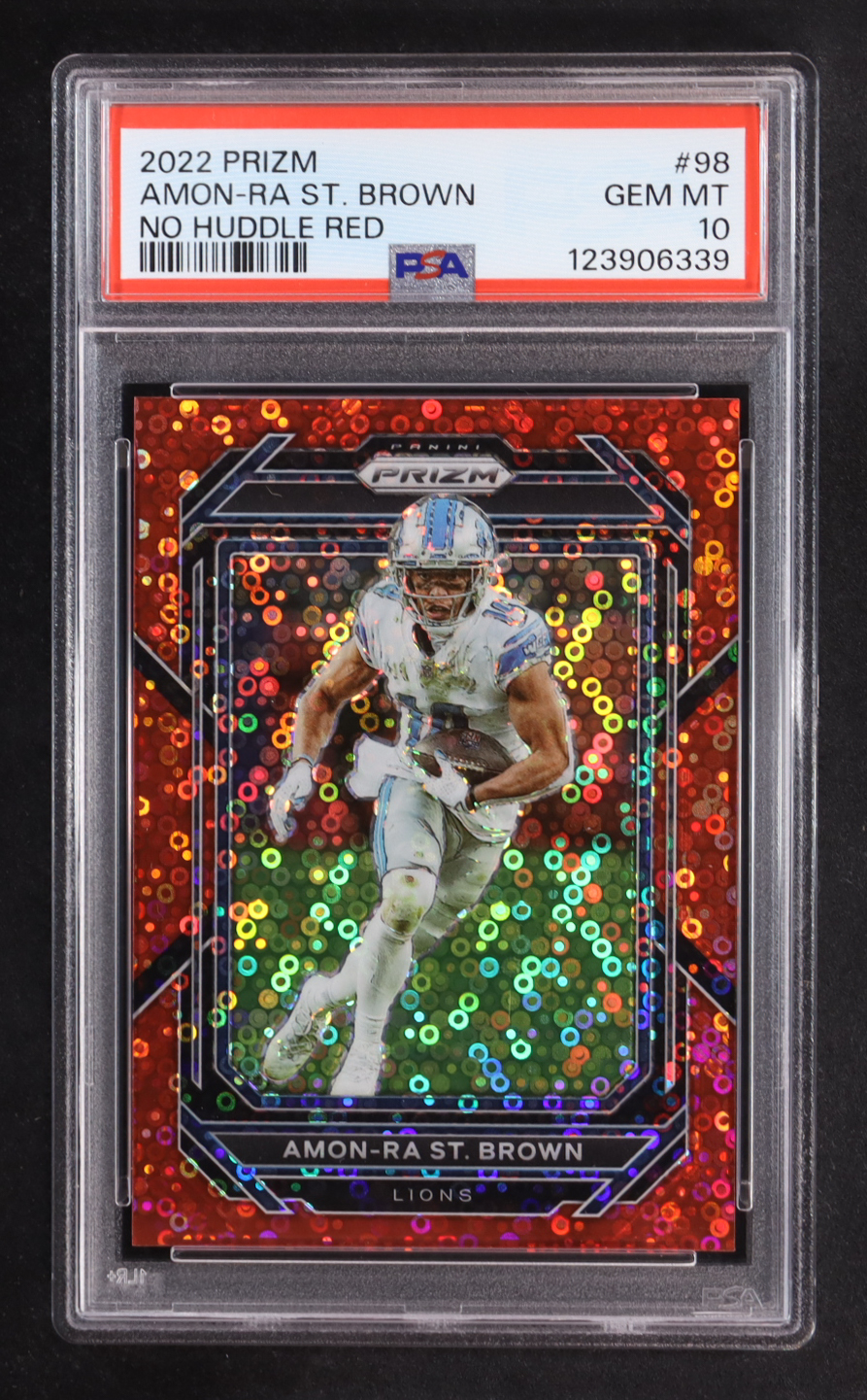 Amon-Ra St. Brown 2022 Panini Prizm Prizms No Huddle Red #98 #41/50 (PSA 10)