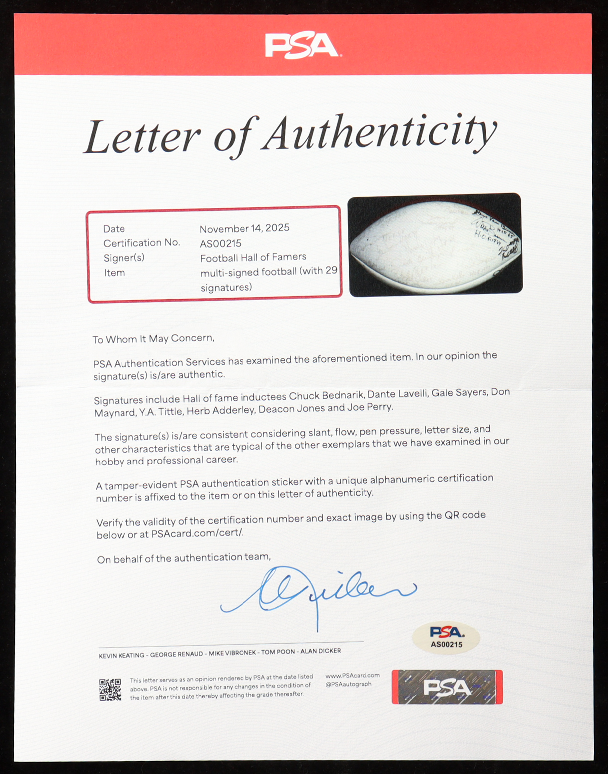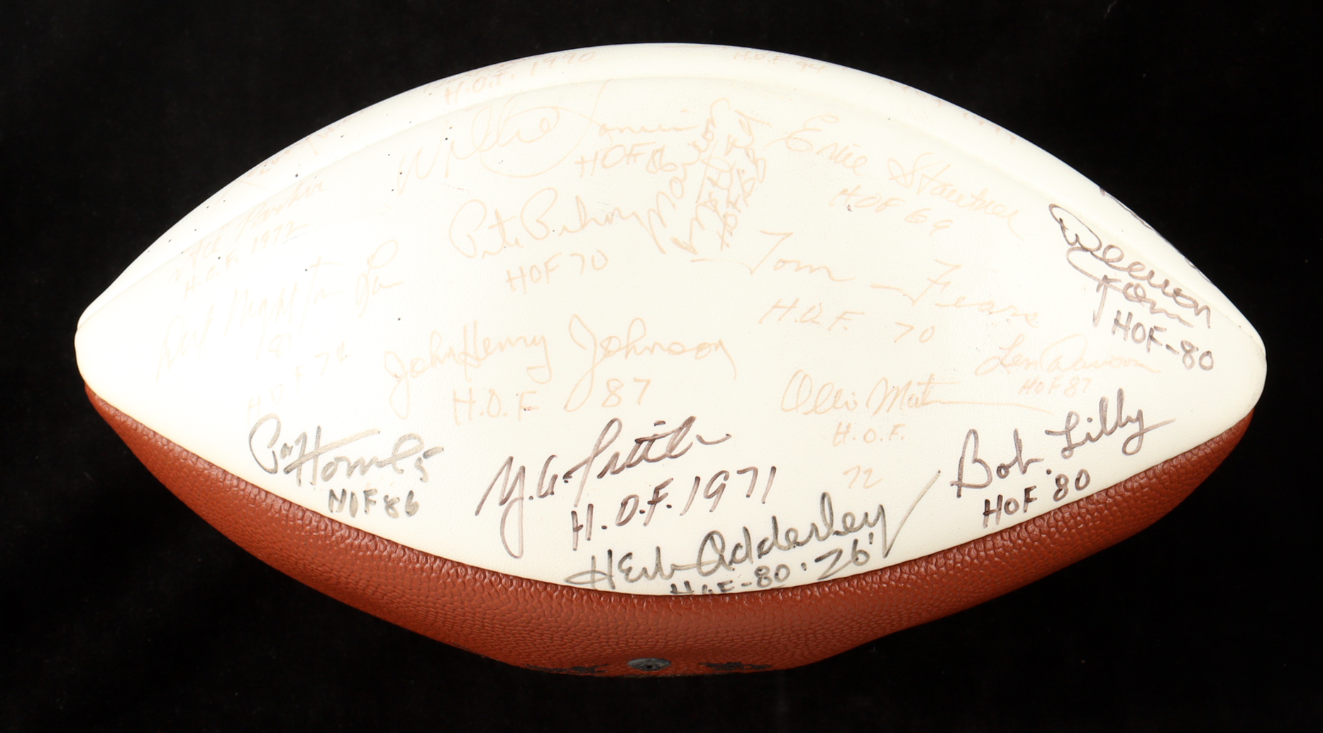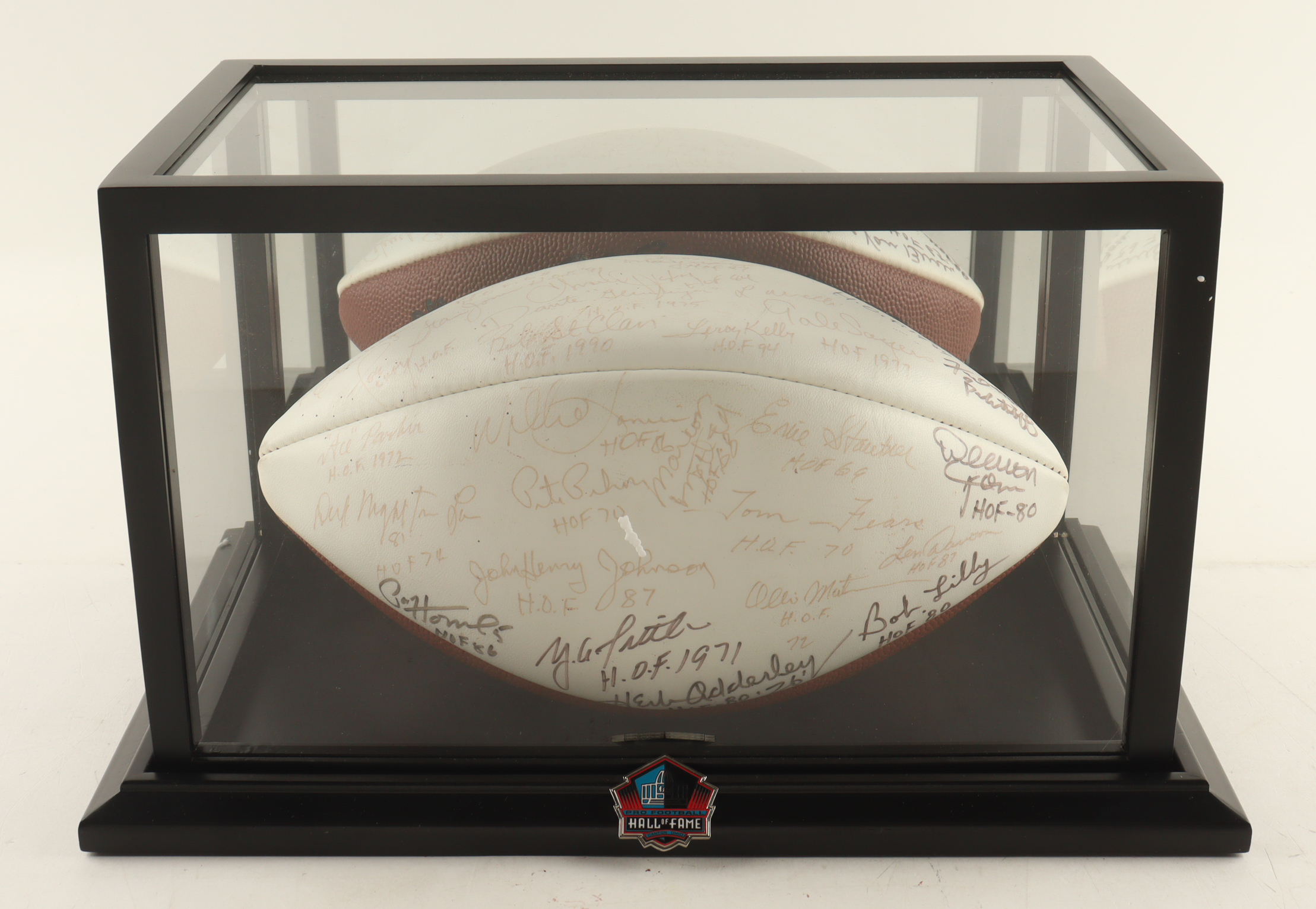 Football Hall of Famers NFL Football Signed by (29) Y.A. Tittle, Chuck Bednarick, Gayle Sayer with Multiple HOF Inscriptions & Display Case (PSA)