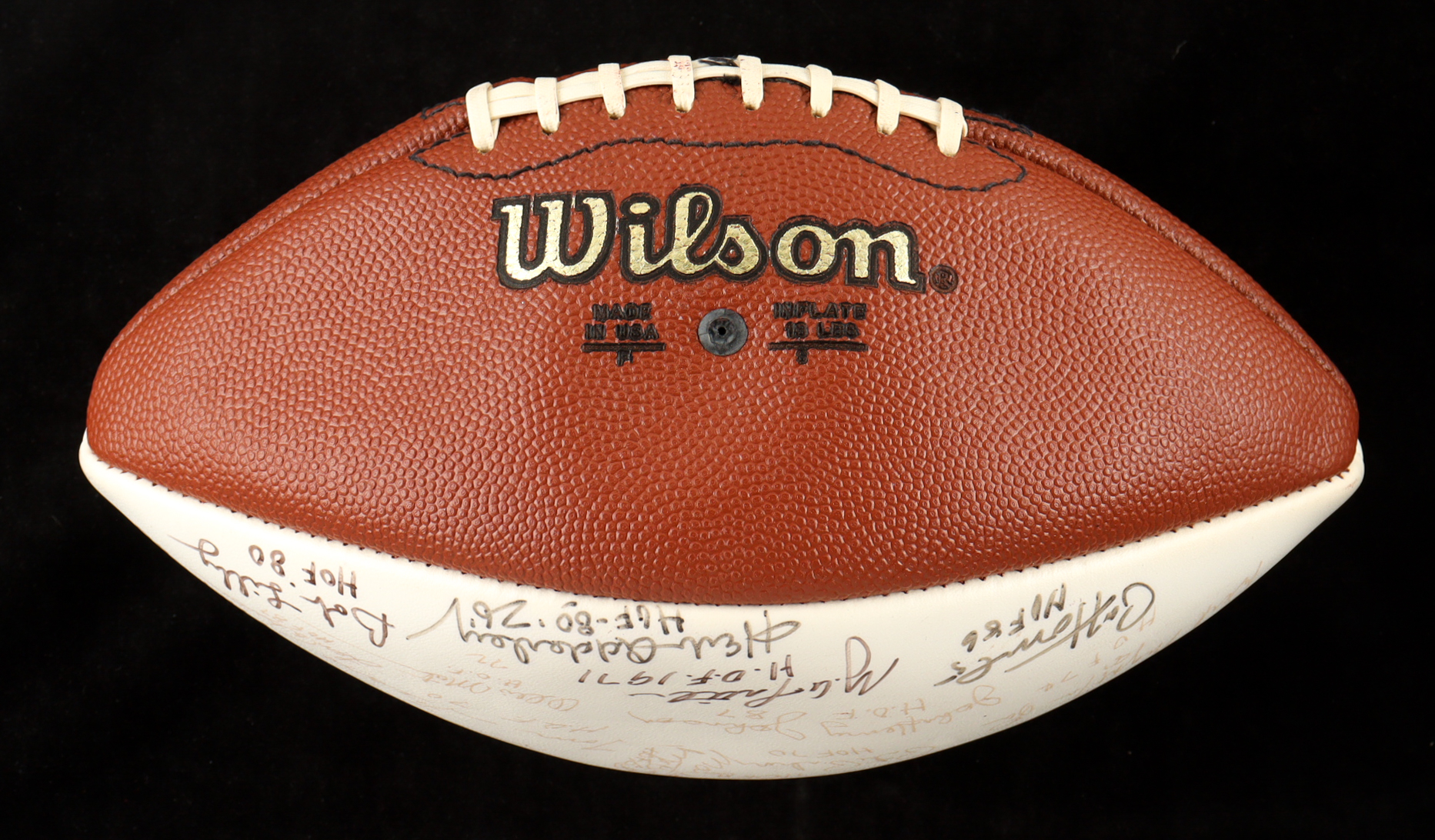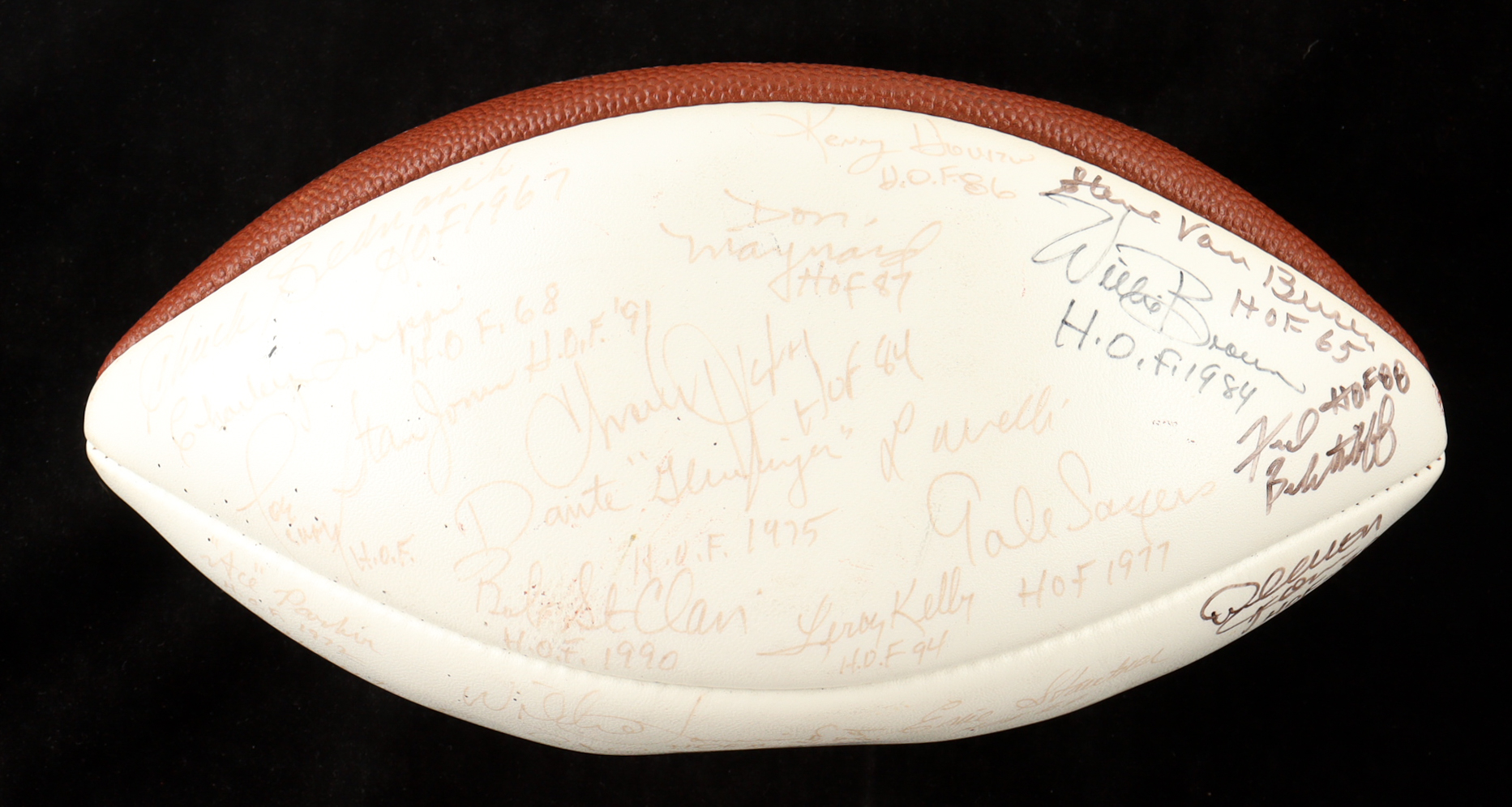 Football Hall of Famers Wilson NFL Football. Hand-signed by (29) with Chuck Bednarik, Dante Lavelli, Gale Sayers, Don Maynard, Y.A. Tittle, Herb Adderley, Deacon Jones, Joe Perry and (21) others. The display case is included as shown. Please note, signatures are faded. Refer to photos regarding the condition of the item.