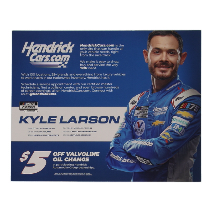 Photo measures 8" x 10" in size and has been hand-signed by Kyle Larson.