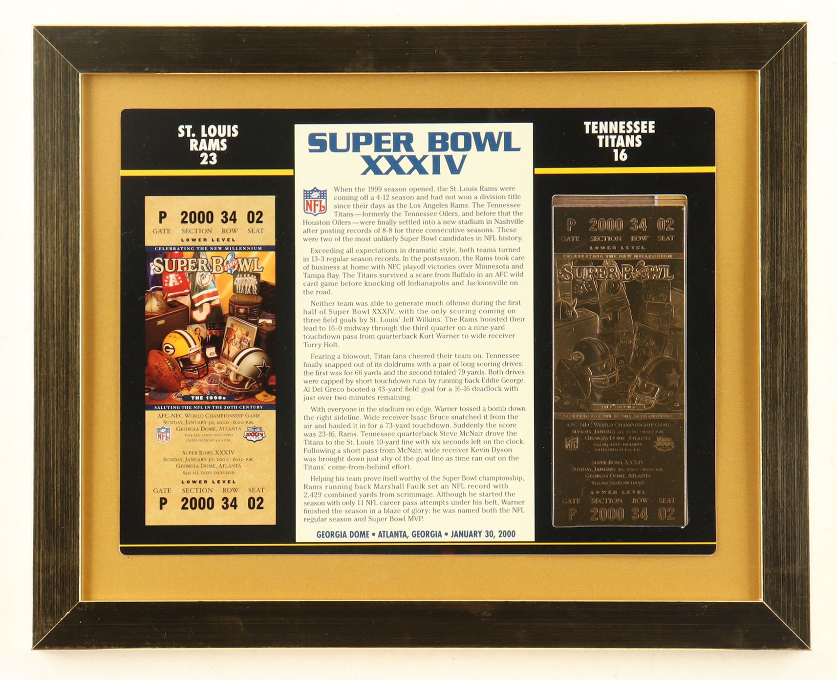 Custom Framed Super Bowl XXXIV Commemorative Score Card with 23KT Gold Ticket Framed Display