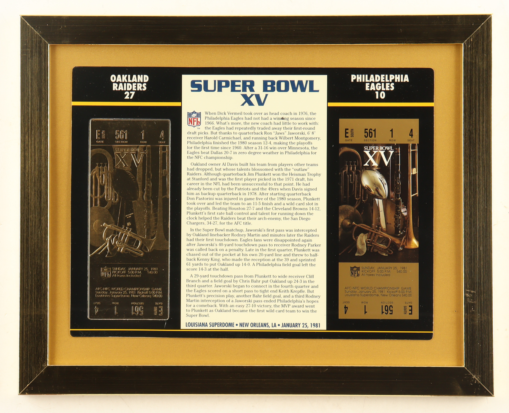 Custom Framed Super Bowl XV Commemorative Score Card with 23KT Gold Ticket Framed Display