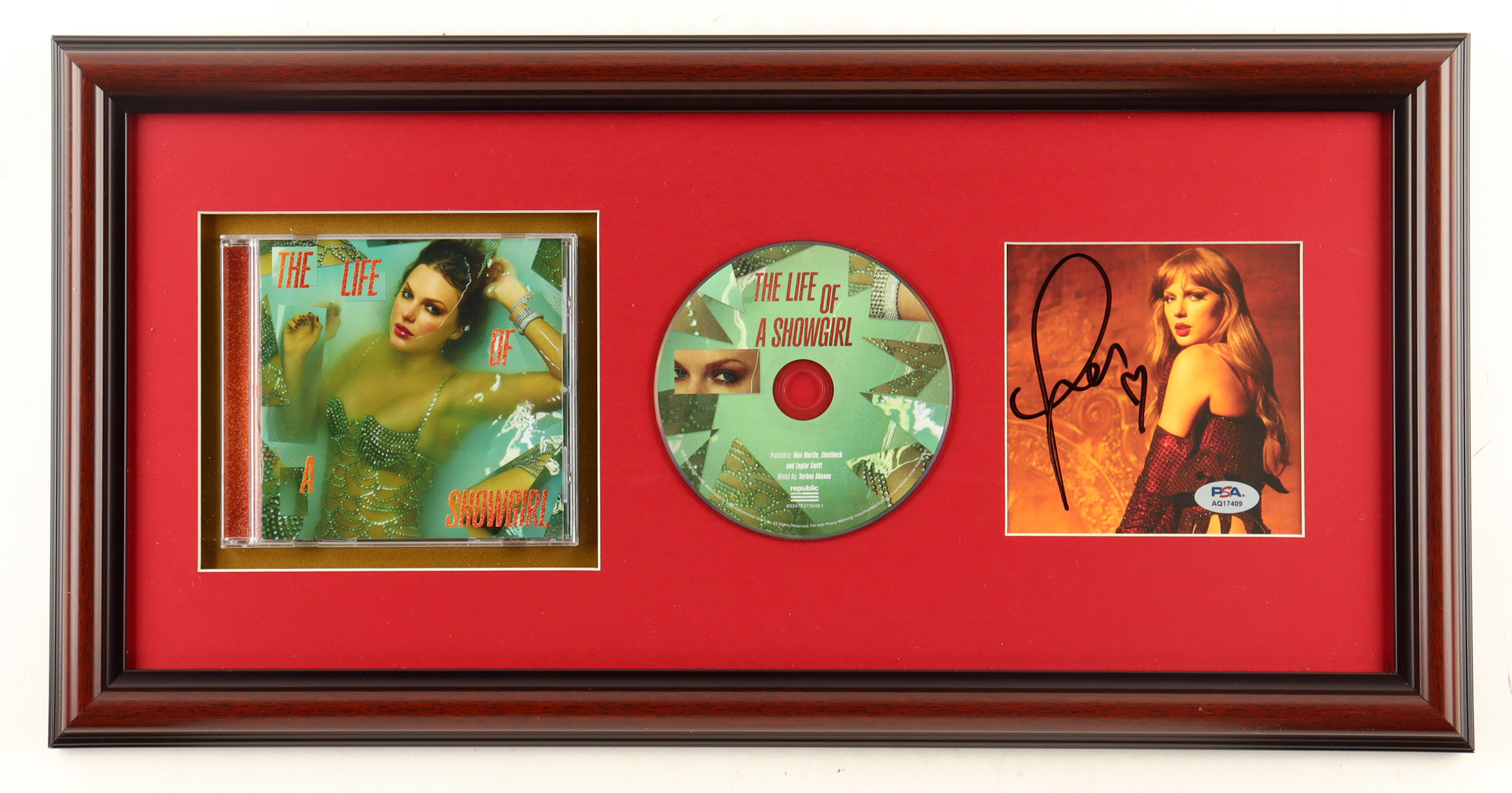 Custom frame measures approximately 11" x 22" in size. Features a "The Life of a Showgirl" CD insert that has been hand-signed by Taylor Swift. The display also includes the disc and case as shown above.