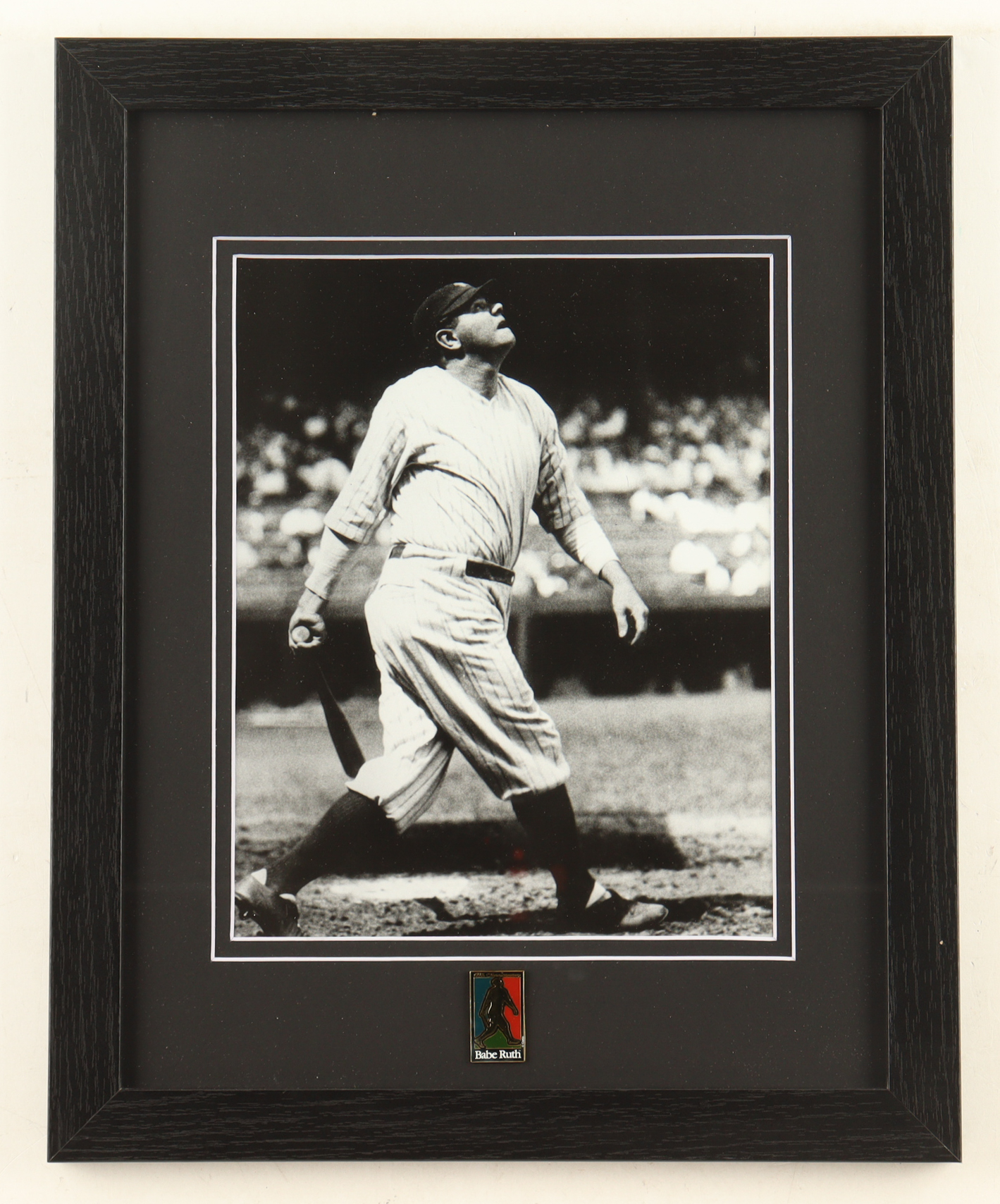 Custom frame measures approximately 13" x 16" in size and features an 8" x 10" photo of Babe Ruth (D. 1942, New York Yankees, HOF). Display also includes a Babe Ruth Home Run Swing pin. Please note, the item is unsigned.