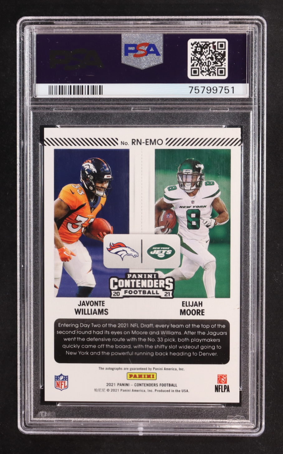 Elijah Moore / Javonte Williams 2021 Panini Contenders Round 2 Numbers Dual Autographs #RN-EMO RC #45/49 (PSA 9 | Autograph Graded PSA 10)