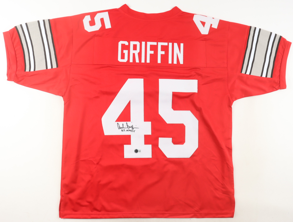 Custom jersey with everything sewn on, size XL. Hand-signed and inscribed by Archie Griffin.