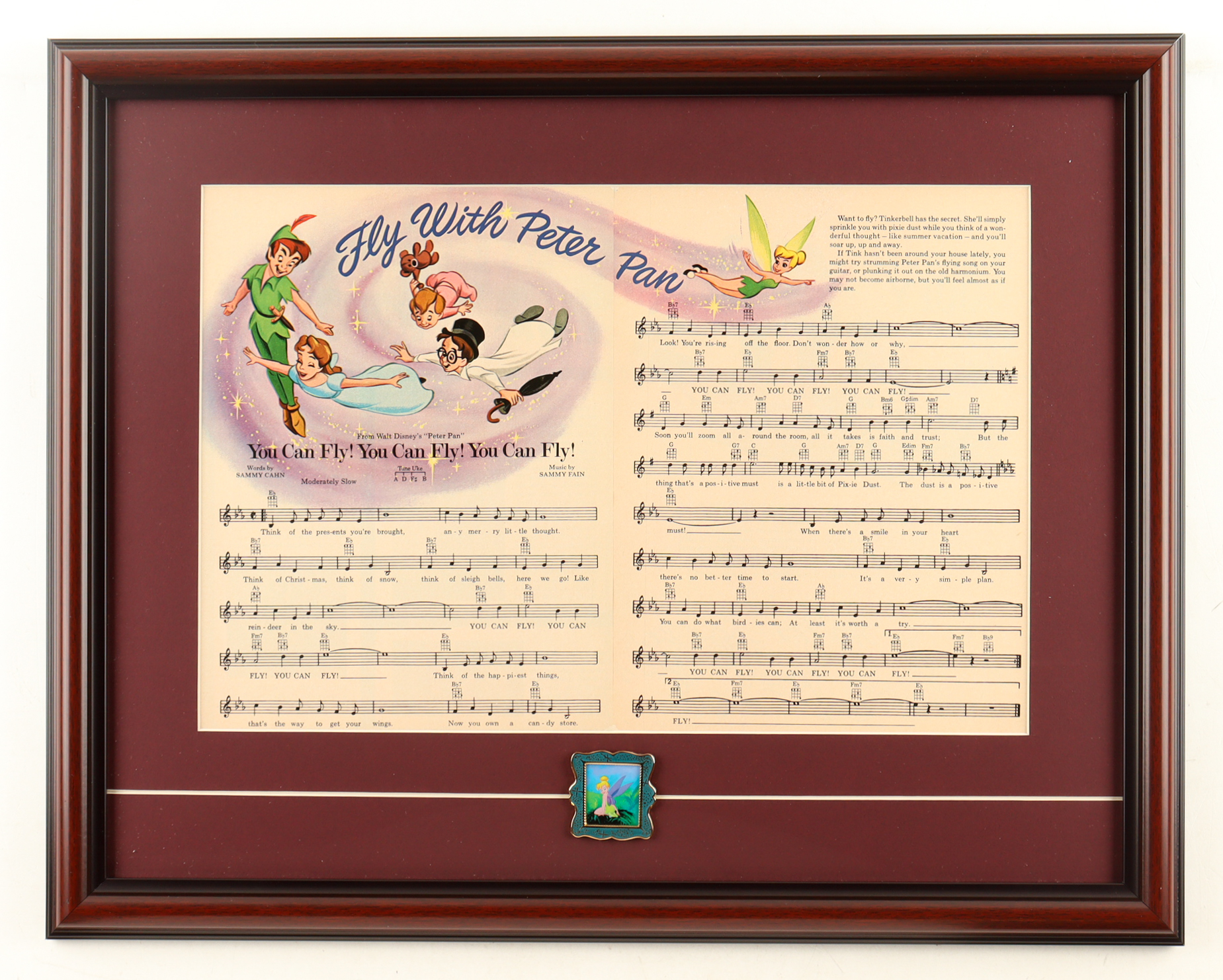 Walt Disney's 1960 "You Can Fly" Custom Framed Sheet Music Display with Tinker Bell Pin