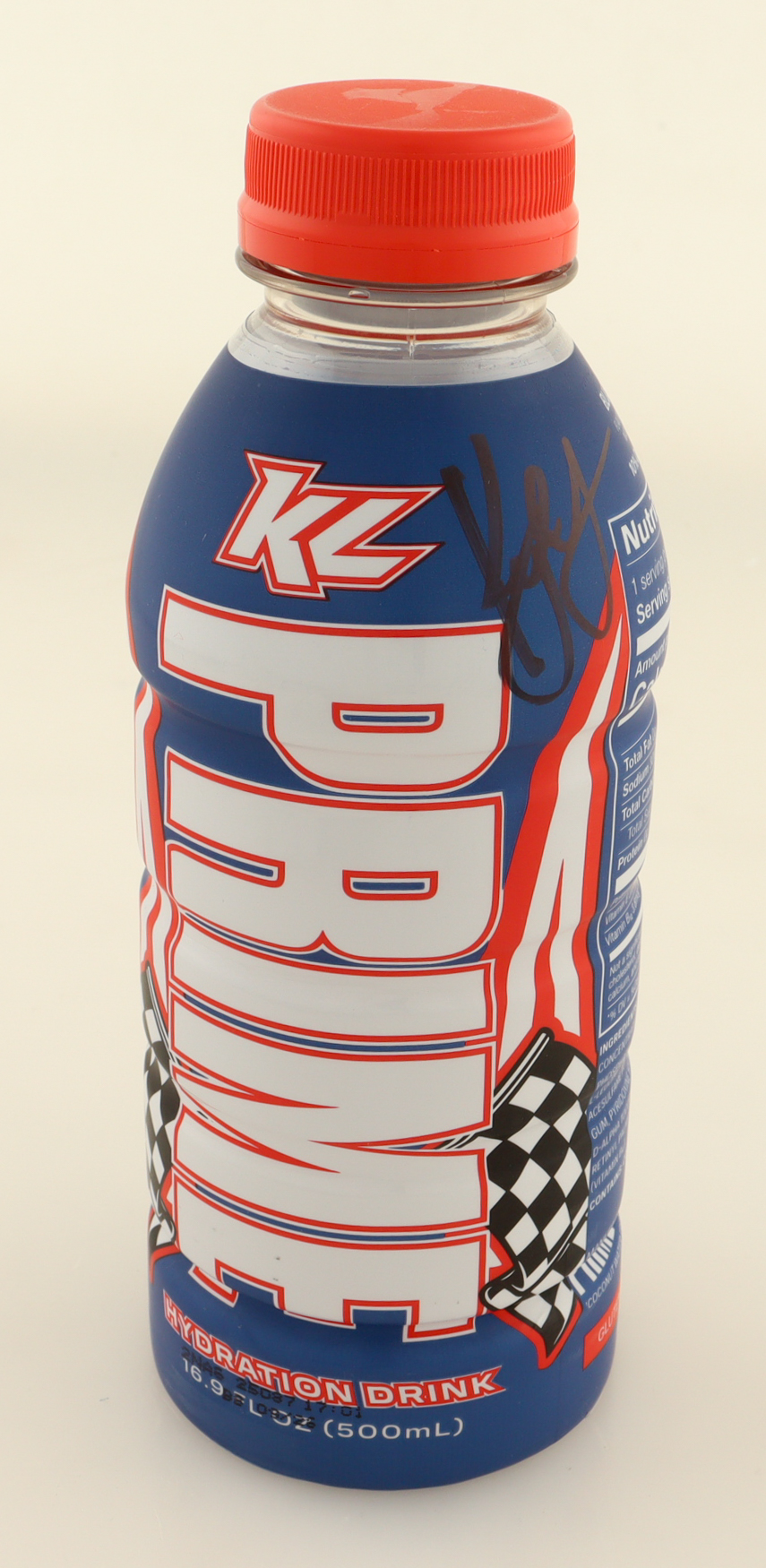 Full, unopened Prime energy drink bottle. Hand-signed by Kyle Larson.