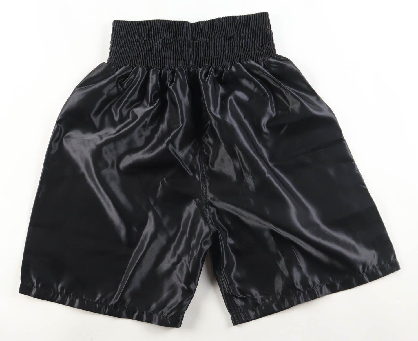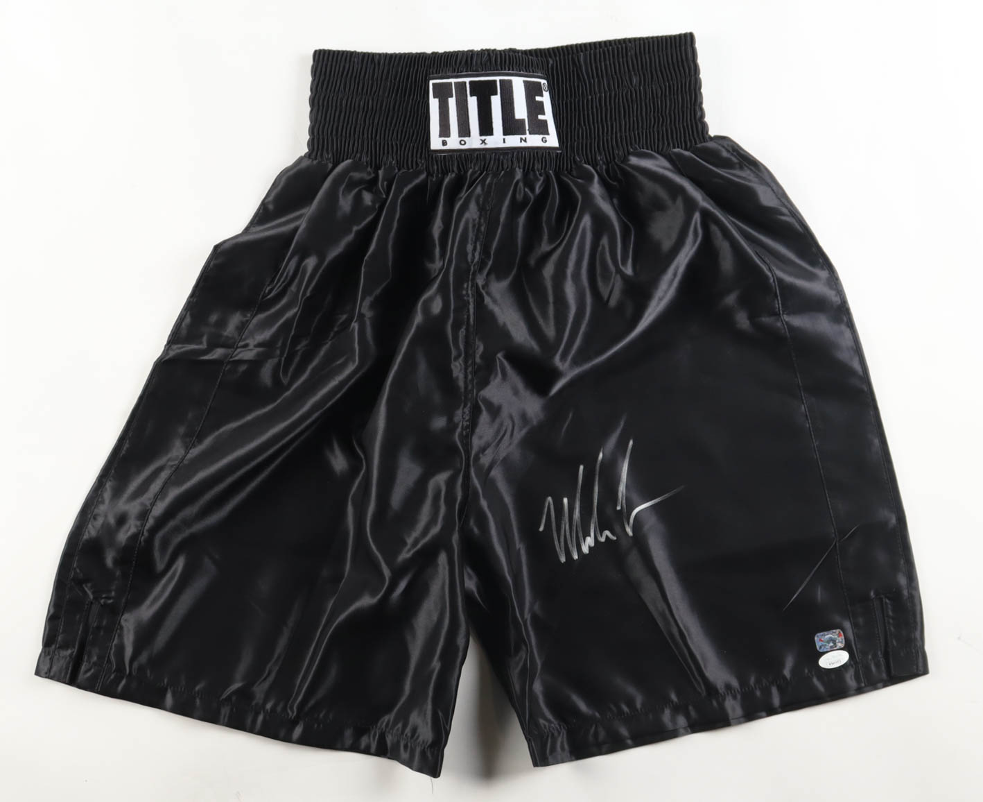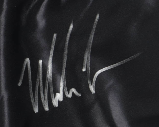 Title boxing shorts with everything sewn on, size XL. Hand-signed by Mike Tyson (HOF).