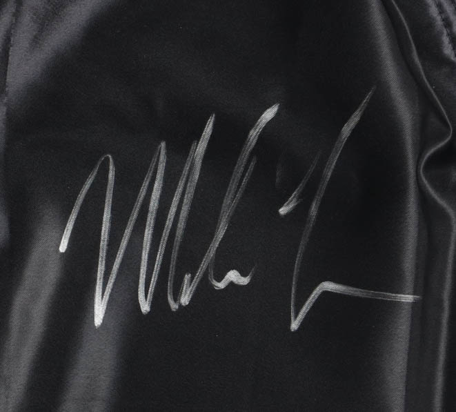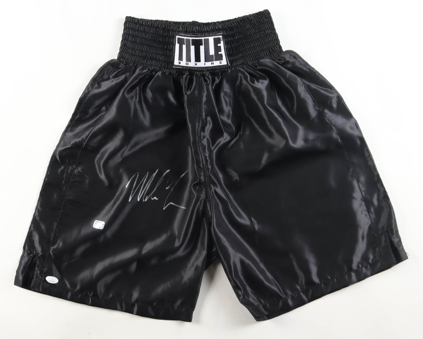 Title boxing shorts with everything sewn on, size XL. Hand-signed by Mike Tyson (HOF).
