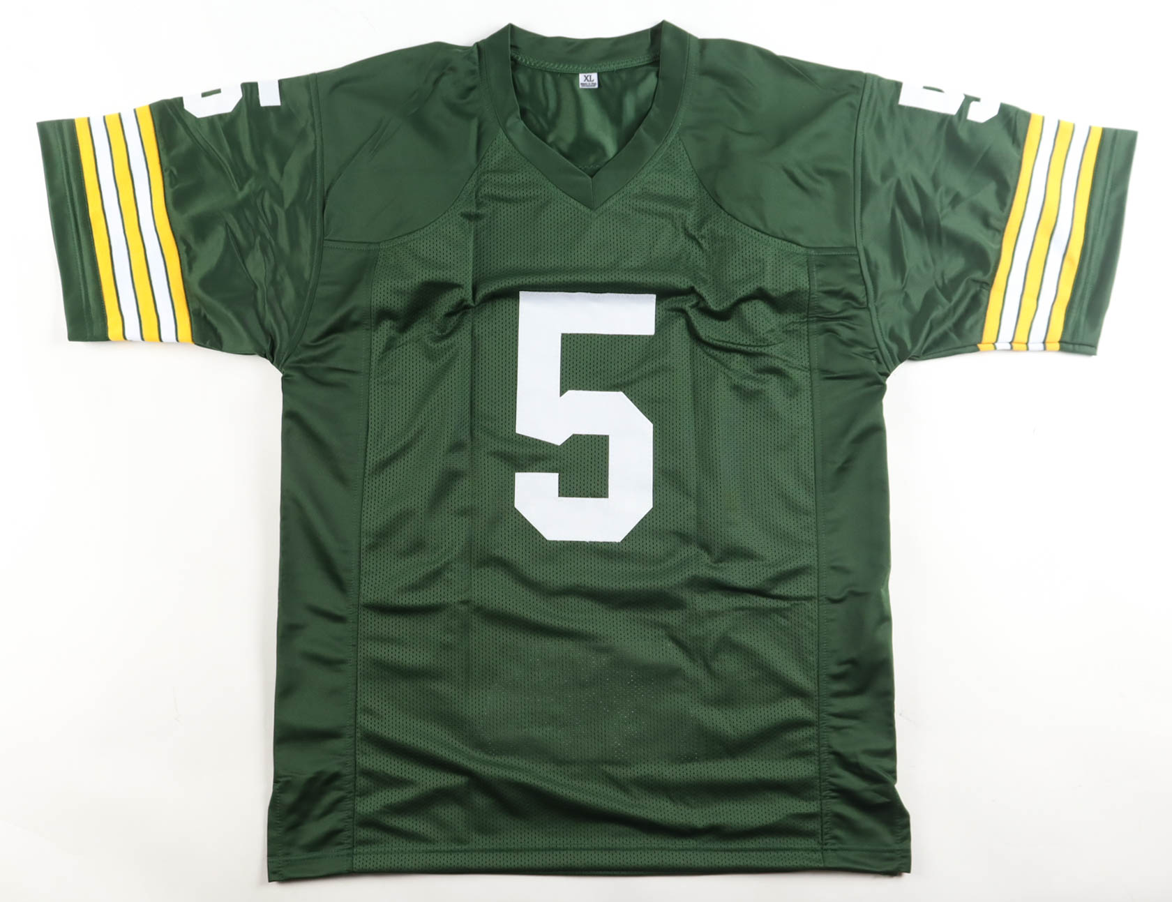 Custom jersey with everything sewn on, size XL. Hand-signed by Paul Hornung (D. 2020, Green Bay Packers, HOF). Hornung's career highlights have been custom stitched onto the back of the jersey below the reverse numbers.