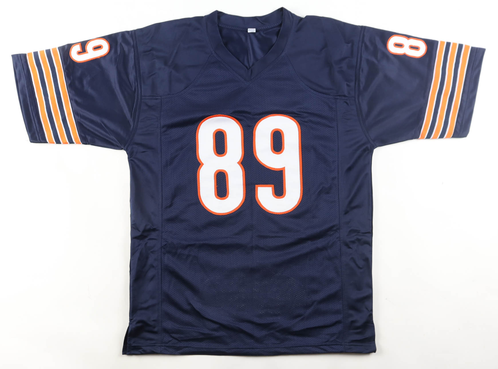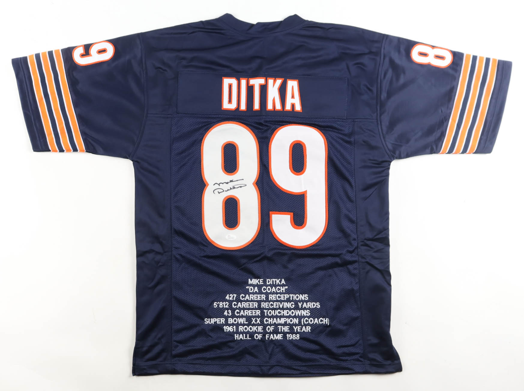 Custom jersey with everything sewn on, size XL. Hand-signed by Mike Ditka (HOF). Ditka's career highlights have been custom stitched onto the back of the jersey below the reverse numbers.