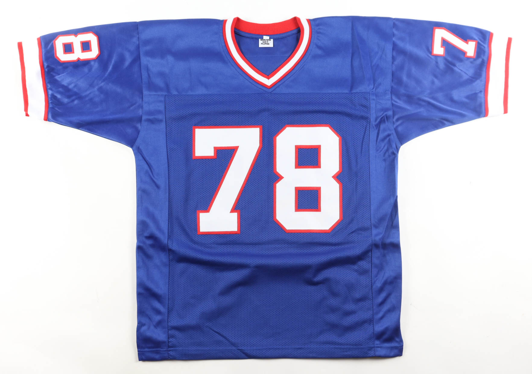 Custom jersey with everything sewn on, size XL. Hand-signed by Bruce Smith (HOF).