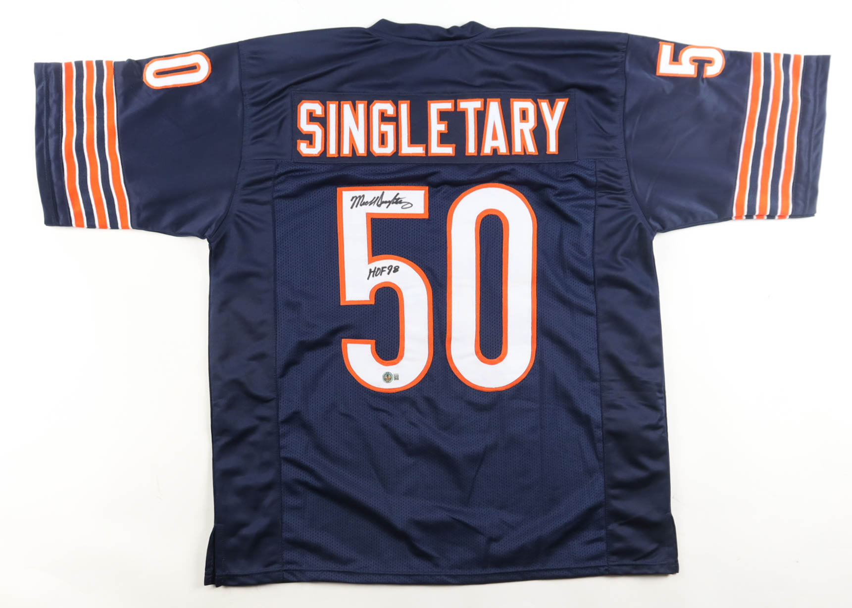 Custom jersey with everything sewn on, size XL. Hand-signed and inscribed by Mike Singletary (Chicago Bears, HOF).