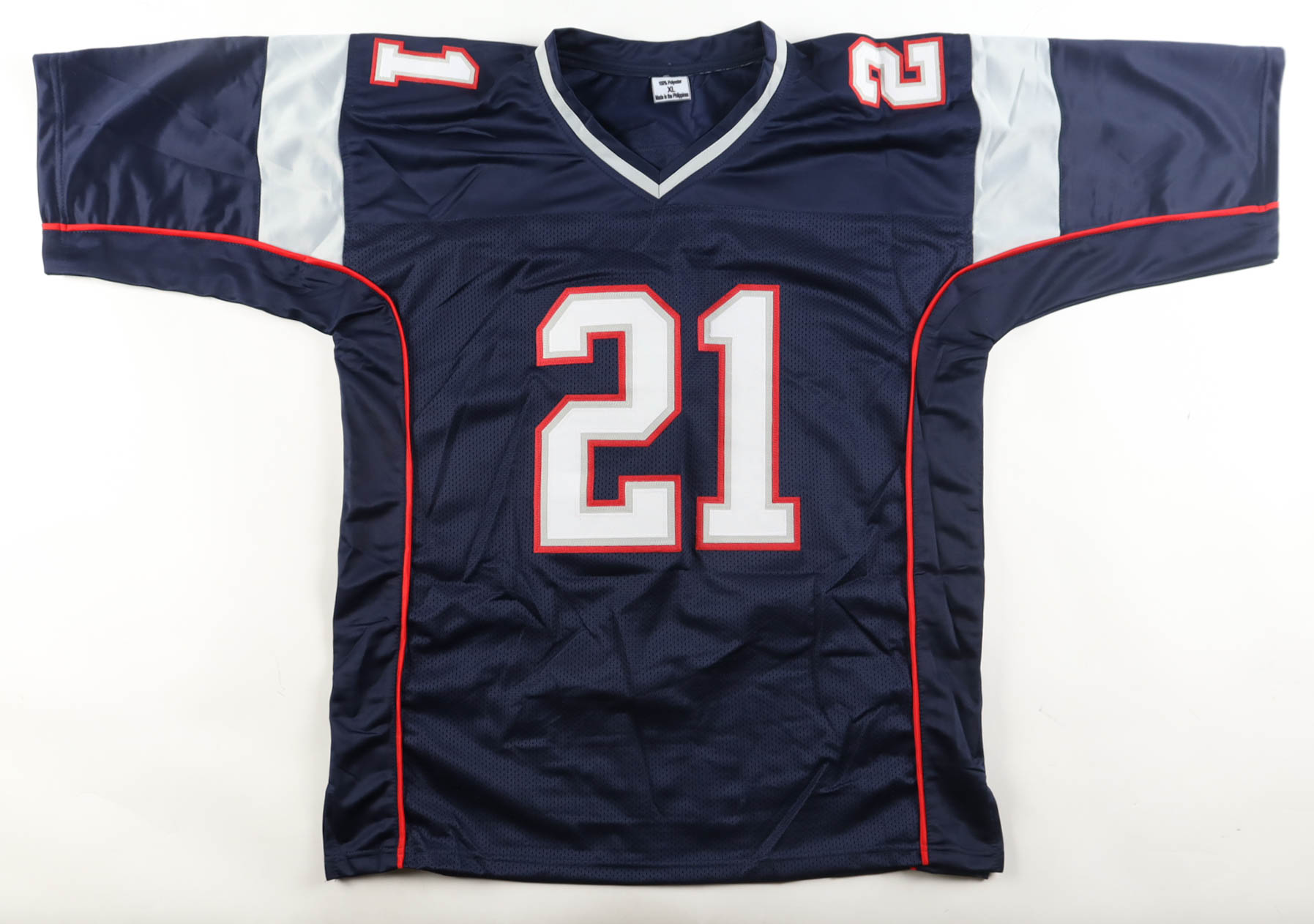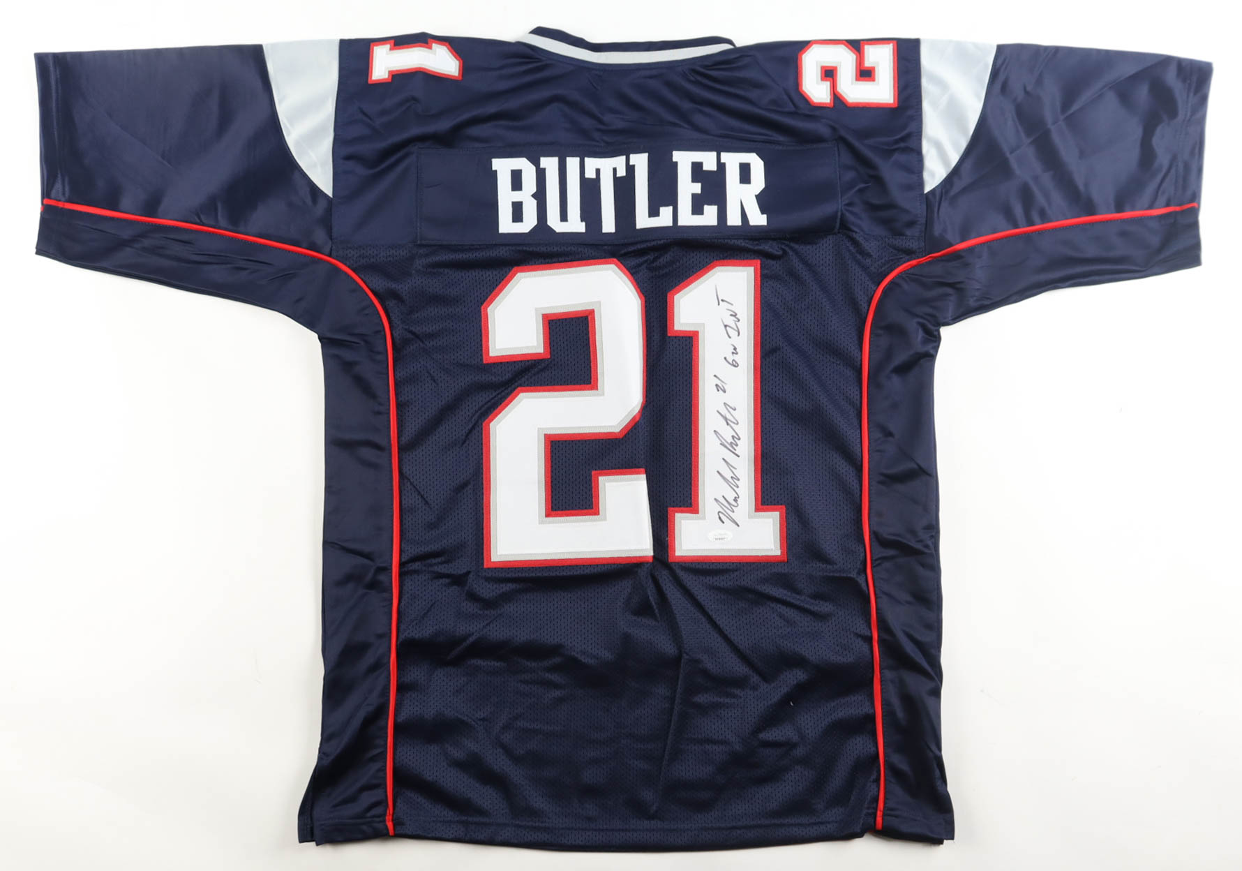 Custom jersey with everything sewn on, size XL. Hand-signed and inscribed by Malcolm Butler (New England Patriots).