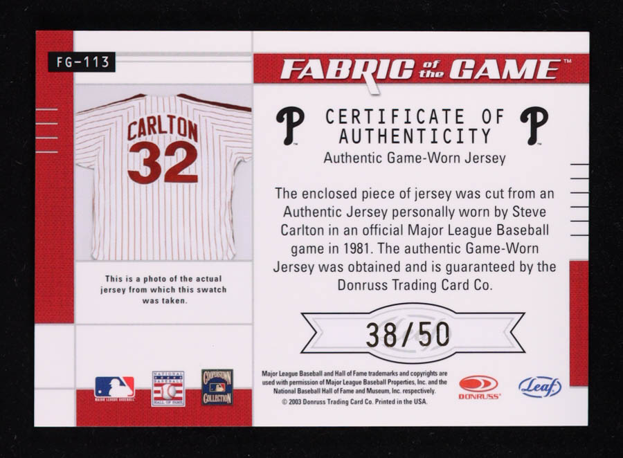 Steve Carlton 2003 Leaf Certified Materials Fabric of the Game #113 #38/50