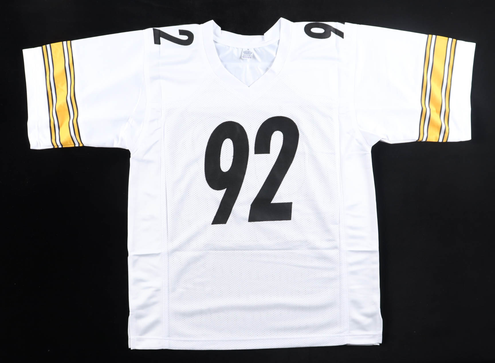 Custom jersey with everything sewn on, size XL. Hand-signed by James Harrison (Pittsburgh Steelers).