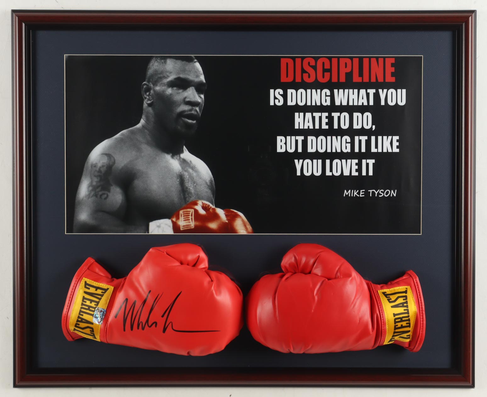 Custom frame measures 17" x 28" in size and features a (2) Everlast boxing gloves that have been hand-signed by Mike Tyson (HOF). Display also features a photo of Mike Tyson.