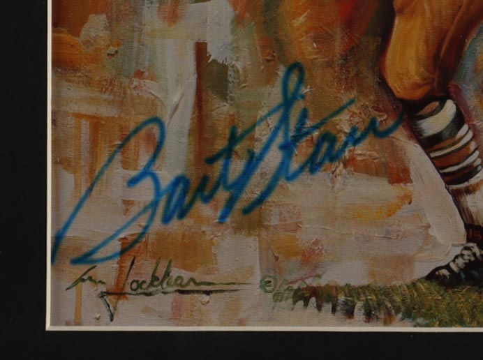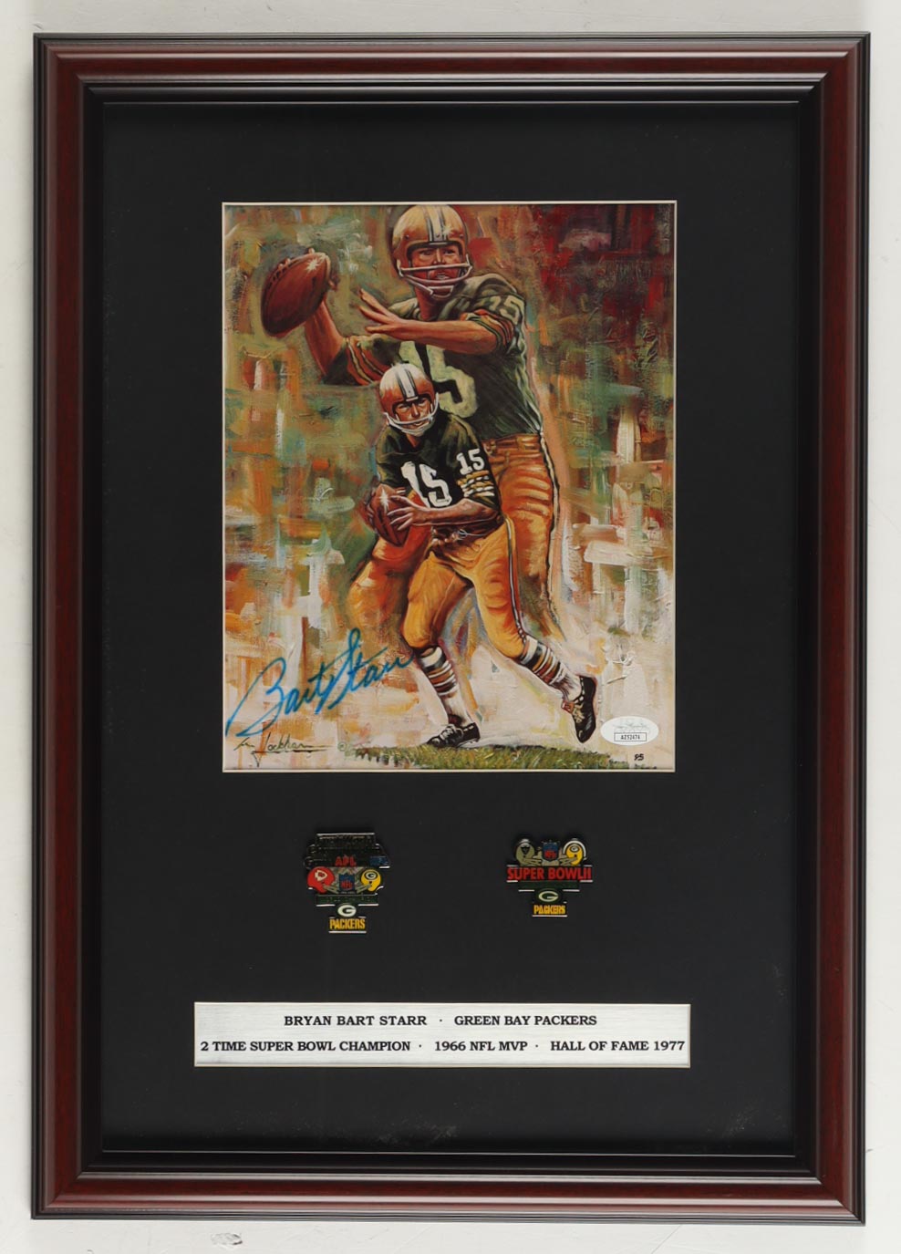 Frame measures approximately 14" x 20" in size. Featuring an 8" x 10" art print that has been hand-signed by Bar Starr (D. 2019, Green Bay Packers, HOF). Display also includes a Bart Starr career stat plaque as well as (2) pins.