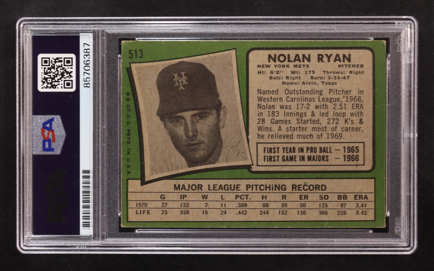 Card has been hand-signed and inscribed by Nolan Ryan (New York Mets). Please see photos for details regarding the condition of the card.