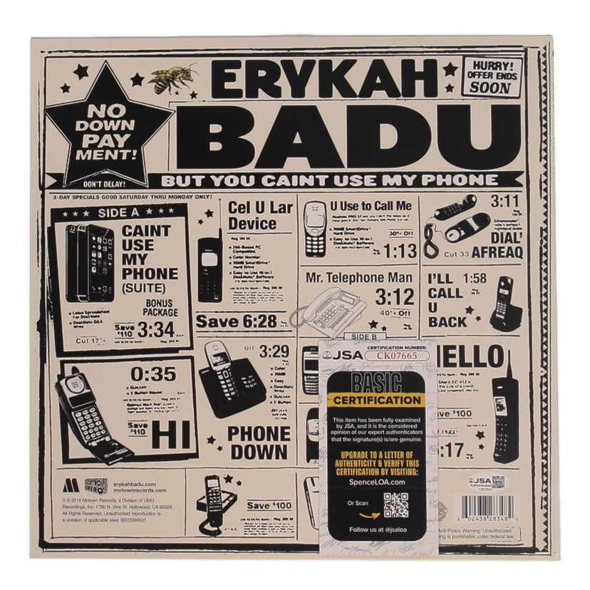 "But You Caint Use My Phone" Vinyl Record Album has been hand-signed by Erykah Badu. Please note, the vinyl record is included and the signature has been smudged. Please see photos for details regarding the condition of the album.